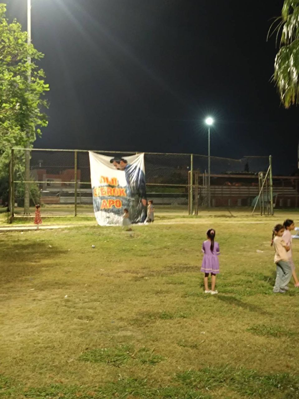 ADANA – Adana’nın Seyhan ilçesine bağlı Barbaros Mahallesi’nde bulunan çocuk parkındaki saha tellerine Önder APO’nun posteri asıldı. Halkların Eşitlik ve Demokrasi Partisi (DEM Parti) Adana Gençlik Meclisi üyeleri tarafından “Sosyalist yaşamda ısrar ediyoruz özgür Önderlik ile örgütleniyoruz” kampanyası kapsamında asılan posterde “Bijî Serok APO” yazıldı.