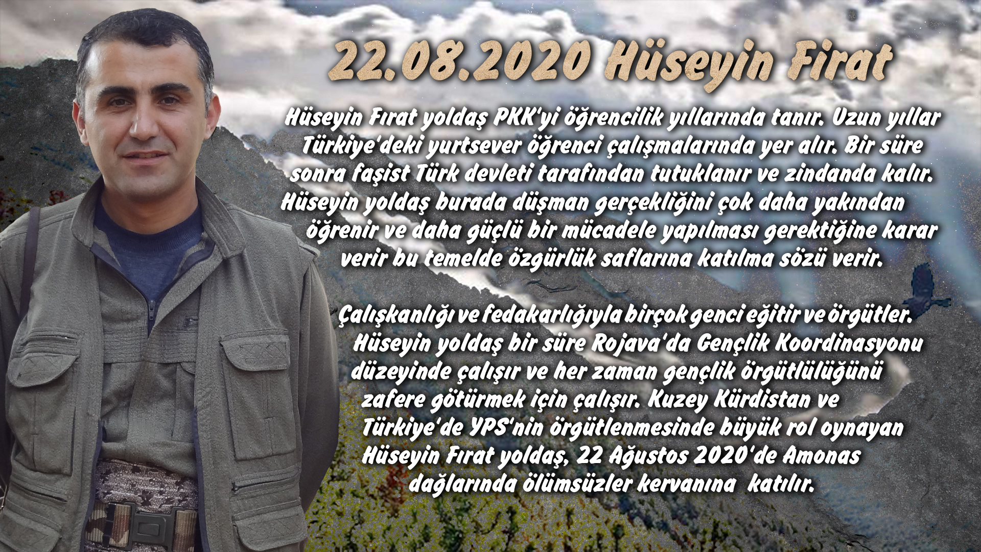 Hüseyin Fırat yoldaş PKK’yi öğrencilik yıllarında tanır. Uzun yıllar Türkiye’deki yurtsever öğrenci çalışmalarında yer alır. Bir süre sonra faşist Türk devleti tarafından tutuklanır ve zindanda kalır. Hüseyin yoldaş burada düşman gerçekliğini çok daha yakından öğrenir ve daha güçlü bir mücadele yapılması gerektiğine karar verir bu temelde özgürlük saflarına katılma sözü verir.