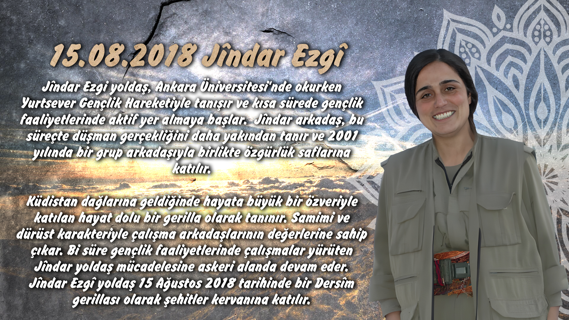 Jîndar Ezgi yoldaş, Ankara Üniversitesi’nde okurken Yurtsever Gençlik Hareketiyle tanışır ve kısa sürede gençlik faaliyetlerinde aktif yer almaya başlar. Jîndar arkadaş, bu süreçte düşman gerçekliğini daha yakından tanır ve 2001 yılında bir grup arkadaşıyla birlikte özgürlük saflarına katılır.
