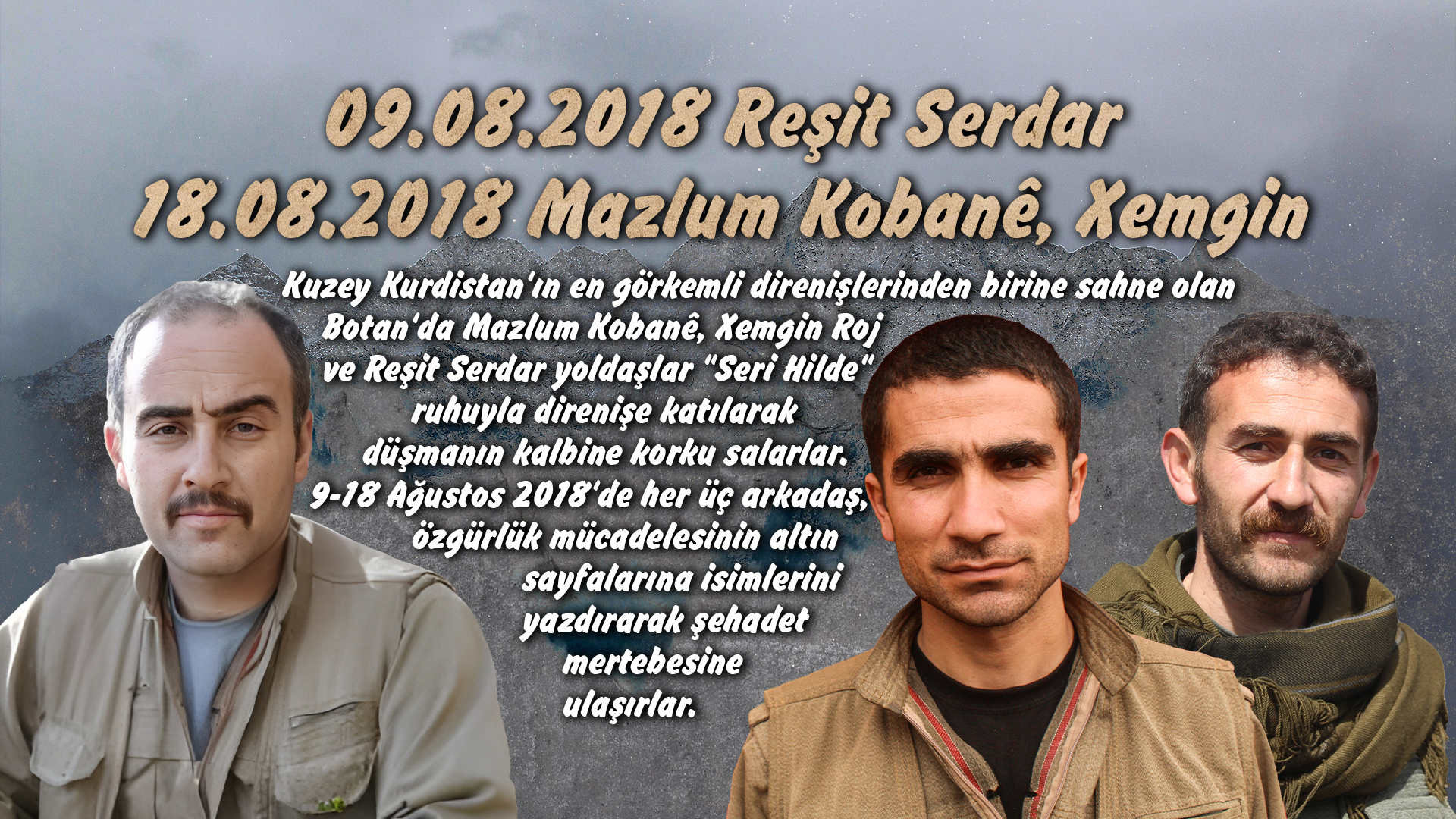 Kuzey Kurdistan’ın en görkemli direnişlerinden birine sahne olan Botan’da Mazlum Kobanê, Xemgin Roj ve Reşit Serdar yoldaşlar “Seri Hilde” ruhuyla direnişe katılarak düşmanın kalbine korku salarlar. 9-18 Ağustos 2018’de her üç arkadaş, özgürlük mücadelesinin altın sayfalarına isimlerini yazdırarak şehadet mertebesine ulaşırlar.