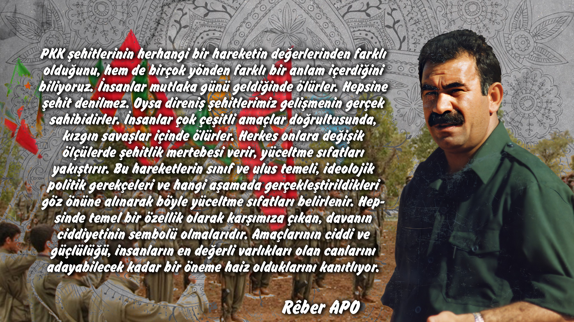 “PKK şehitlerinin herhangi bir hareketin değerlerinden farklı olduğunu, hem de birçok yönden farklı bir anlam içerdiğini biliyoruz. İnsanlar mutlaka günü geldiğinde ölürler. Hepsine şehit denilmez. Oysa direniş şehitlerimiz gelişmenin gerçek sahibidirler. İnsanlar çok çeşitli amaçlar doğrultusunda, kızgın savaşlar içinde ölürler. Herkes onlara değişik ölçülerde şehitlik mertebesi verir, yüceltme sıfatları yakıştırır. Bu hareketlerin sınıf ve ulus temeli, ideolojik politik gerekçeleri ve hangi aşamada gerçekleştirildikleri göz önüne alınarak böyle yüceltme sıfatları belirlenir. Hepsinde temel bir özellik olarak karşımıza çıkan, davanın ciddiyetinin sembolü olmalarıdır. Amaçlarının ciddi ve güçlülüğü, insanların en değerli varlıkları olan canlarını adayabilecek kadar bir öneme haiz olduklarını kanıtlıyor.”