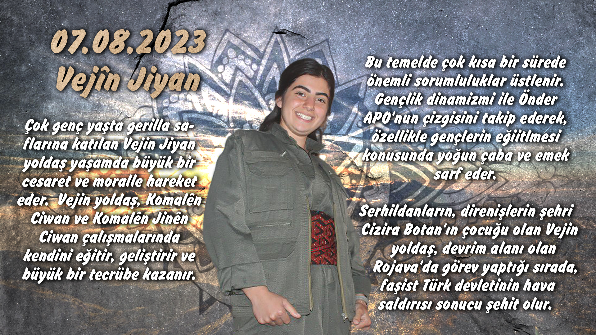 Serhildanların, direnişlerin şehri Cizira Botan’ın çocuğu olan Vejin yoldaş, devrim alanı olan Rojava’da görev yaptığı sırada, faşist Türk devletinin hava saldırısı sonucu şehit olur.