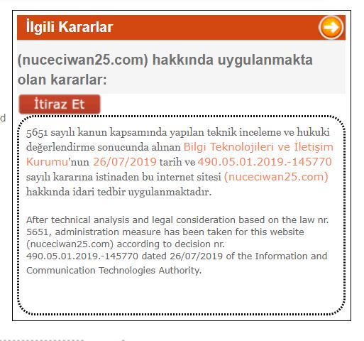 “5651 sayılı kanun kapsamında yapılan teknik inceleme ve hukuki değerlendirme sonucunda alınan Bilgi Teknolojileri ve İletişim Kurumu‘nun 26/07/2019 tarih ve 490.05.01.2019.-14770 sayılı kararına istinaden bu internet sitesi (nuceciwan25.com)hakkında idari tedbir uygulanmaktadır
