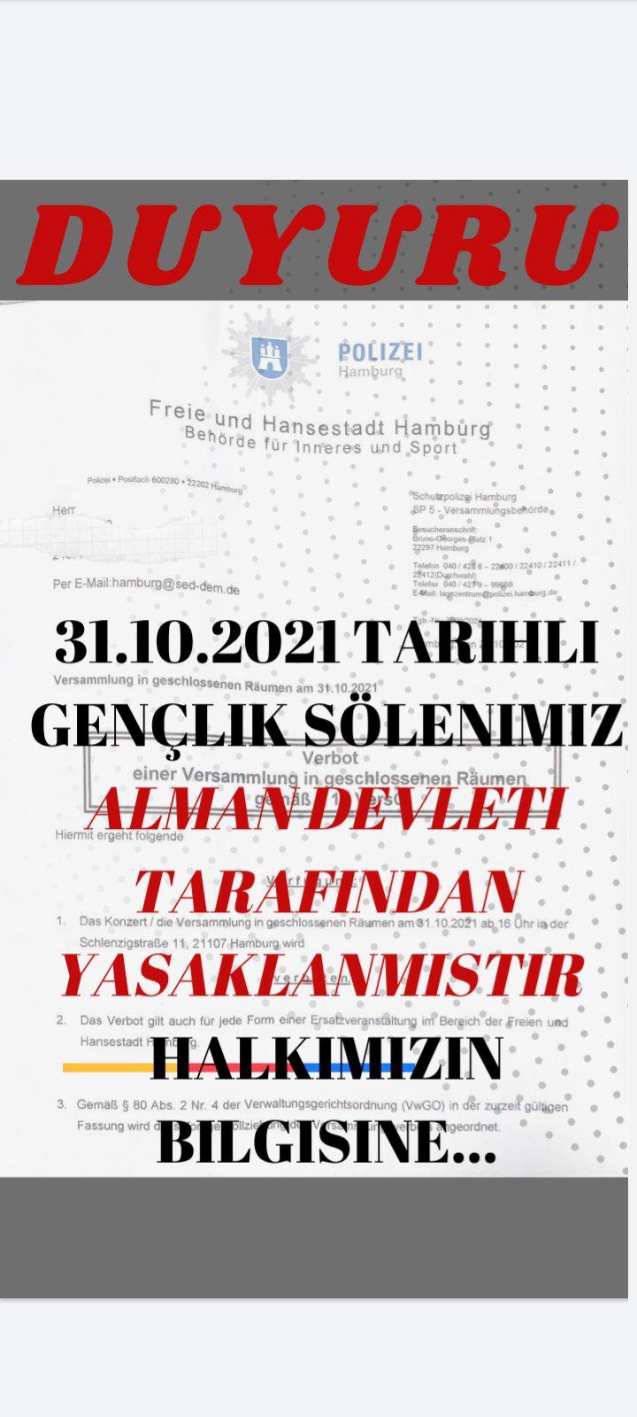 HABER MERKEZİ – 31 Ekim’de TCŞ (Tevgera Ciwanên Şoreşger) ve TekoJIN (Jinên Ciwan ên Tekoşer) aktivistleri tarafından Hamburg’da gençlik şöleni düzenlenmesi bekleniyordu. Gençler bugün faşist Alman polisi tarafından “etkinlik düzenlenemez” adı altında yazılı bir belge aldı.