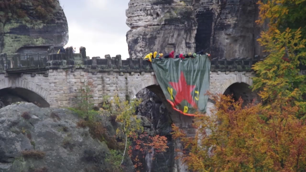 DRESDEN – Dün Almanya’nın Dresden şehri yakınlarında bulunan tarihi Bastei Köprüsü’ne asılan devasa YPJ bayrağının görüntüleri yayınlandı. Yayınlanan videoda aktivistlerin bayrağı astığı anların görüntüleri bulunuyor.