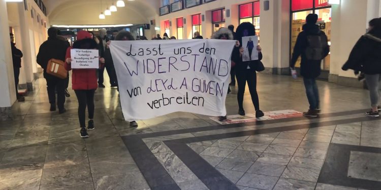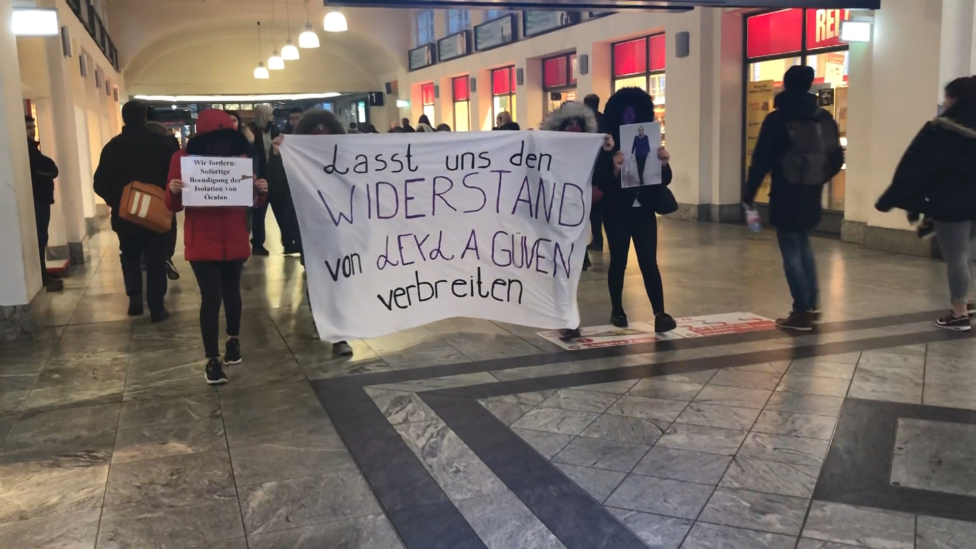 DARMSTADT – Jinên Ciwan ên Azad aktivistleri bu akşam Almanya’nın Darmstadt şehrinde bir flashmob eylemi gerçekleştirdi. Almanca “Leyla Güven’in direnişini büyütelim” yazan bir pankart taşıyan genç kadınlar, merkez tren istasyonunda yüzleri maskeli bir şekilde ve sessizce yürüdüler. Yoldan geçenlerin oldukça ilgisini çeken eylemde, Halklar Önder Abdullah Öcalan’a uygulanan tecridin kaldırılması için süresiz açlık grevini sürdüren Leyla Güven’in talebi sahiplenildi.