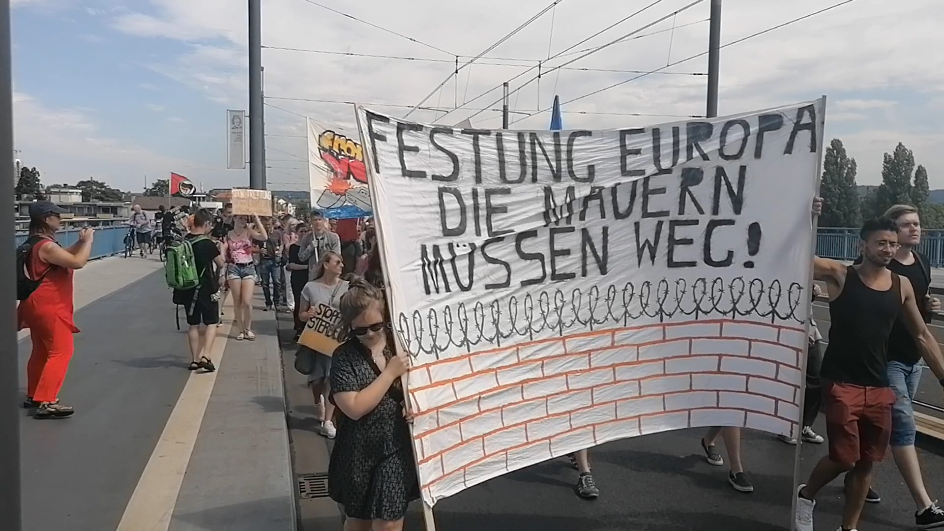 Ardından Bonn şehri içinde devam eden yürüyüş şehir merkezinde sonlandırıldı. Yürüyüşte çoğu genç 300’den fazla kişi yer aldı. Mültecilerin açık denizlerde kaderlerine terk edilmelerine karşı açılan birçok pankartla eylemciler taleplerini dile getirdi. Eylem boyunca “Yaşasın enternasyonal dayanışma!” ve “Sınır olmasın, ulus olmasın, sınır dışı edilmeye karşı savaş!” sloganlarının yanı sıra kapitalizm karşıtı ve antifaşist birçok slogan atıldı. Eylemciler, mültecilerin sınır dışı edilmesi için aktif çalışan ve içişleri bakanı Horst Seehofer’e de sloganlarında yer vererek “Seehofer sınır dışı edilsin!” yazılı bir pankart da açtılar.