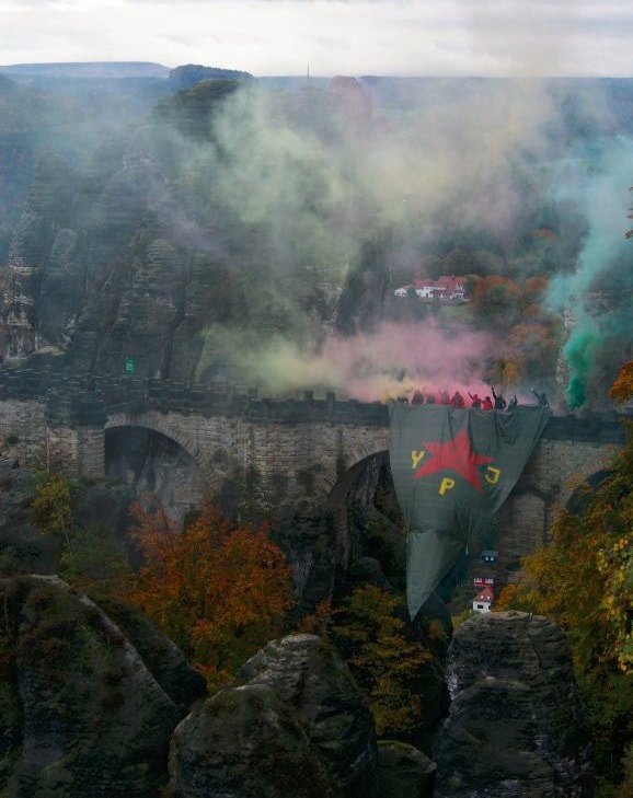 DRESDEN – Almanya’nın Dresden şehri yakınlarındaki tarihi Bastei Köprüsü üzerine bugün devasa bir YPJ bayrağı asıldı. Eylemi gerçekleştiren aktivistler bu eylemleriyle Rojava’da faşist Türk devleti ve çetelerine karşı savaşan YPJ güçlerine destek verdiler.