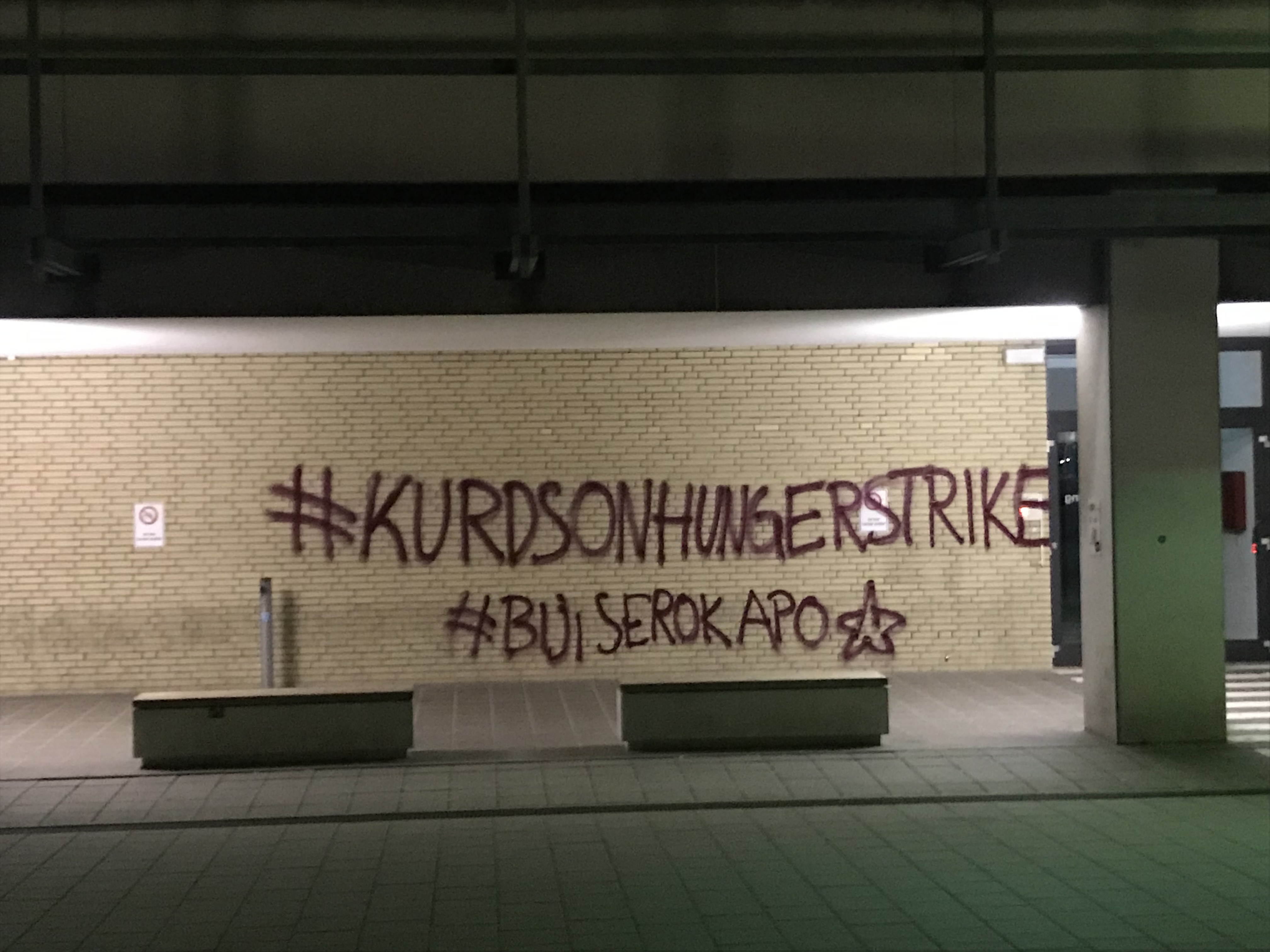 HANNOVER – Kürt gençleri 9 Mayıs’ı 10 Mayıs’a bağlayan gece Almanya’nın Hannover şehrinde bir eylem gerçekleştirdi. Gençler üniversite kütüphanesinin dış duvarlarına sprey boyayla #KurdsOnHungerStrike (Kürtler Açlık Grevinde) ve #BijiSerokApo yazılamaları yaptılar.