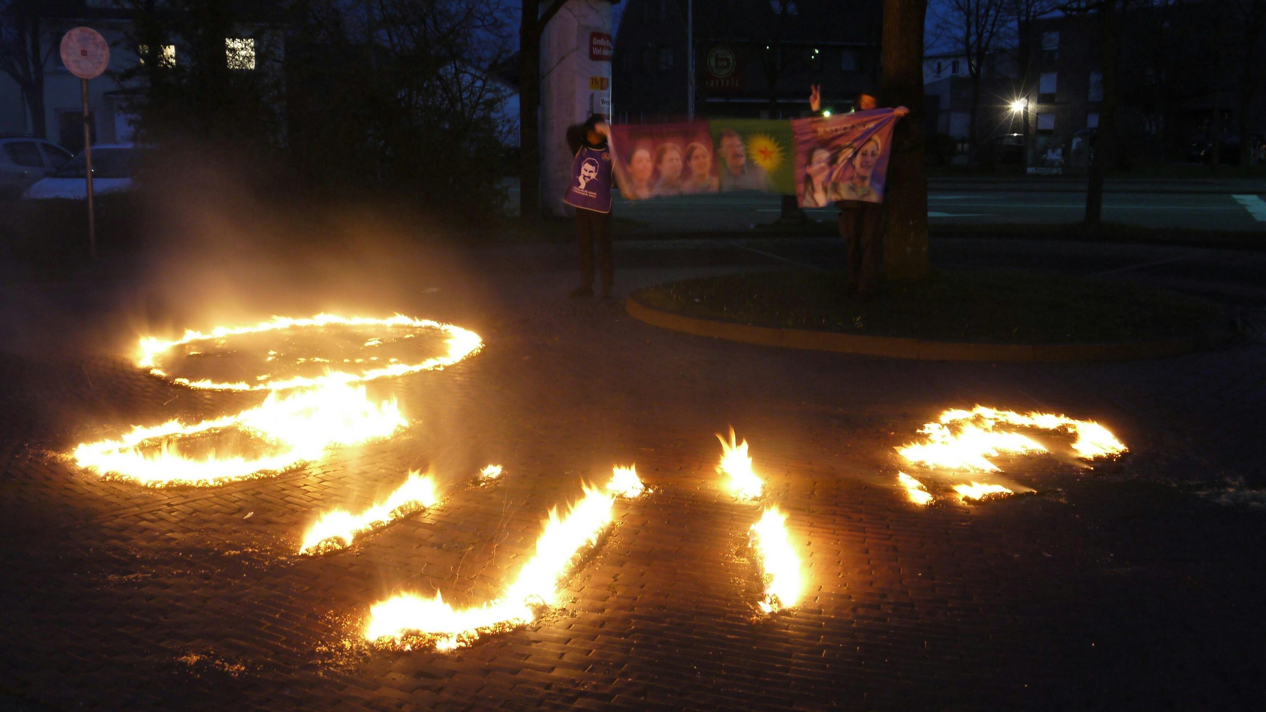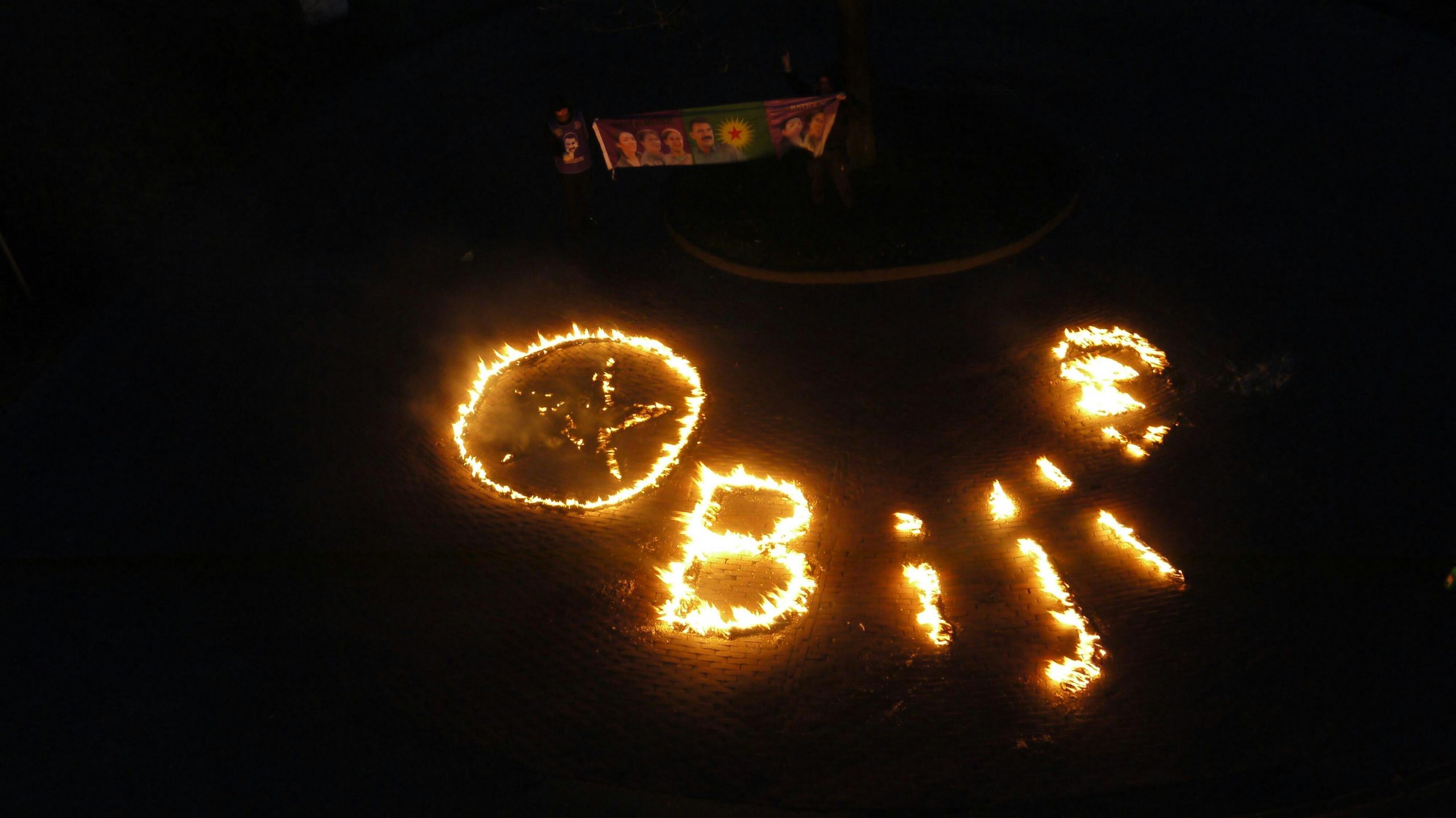 Konsolosluğun önünden ayrılan gençler şehir merkezindeki bir otoyolun üzerindeki köprüye büyük bir pankart astı. “Bijî Serok APO” yazılı pankartı asan gençler, bir de havai fişek attı.