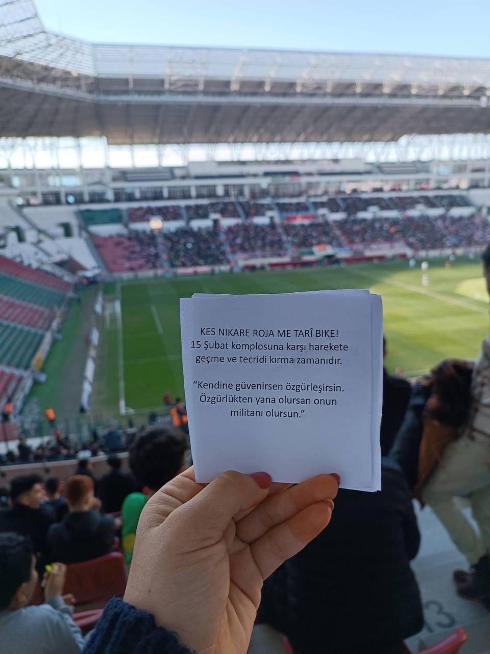 AMED – Yurtsever Gençlik, bugün Amed’de, Amed Spor ve Uşak Spor arasında oynanan ve Amed Spor’un Uşak Spor’u 8-0 yendiği 2’nci Lig Kırmızı Grup Şampiyonluk maçında 15 Şubat komplosunu protesto etmek için üzerinde “Kes Nikare Roja Me Tari Bike” 15 Şubat Komplosuna karşı harekete geçme ve tecridi kırma zamanıdır” “Kendine güvenirsen özgürleşirsin. Özgürlükten yana olursan onun militanı olursun” yazılı kuşlama eylemi gerçekleştirdi. Ayrıca gençler tarafından “Bê Serok jiyan Nabe” “Bijî Serok Apo” ve “Selam, selam, İmralı’ya bin selam” sloganları atıldı.