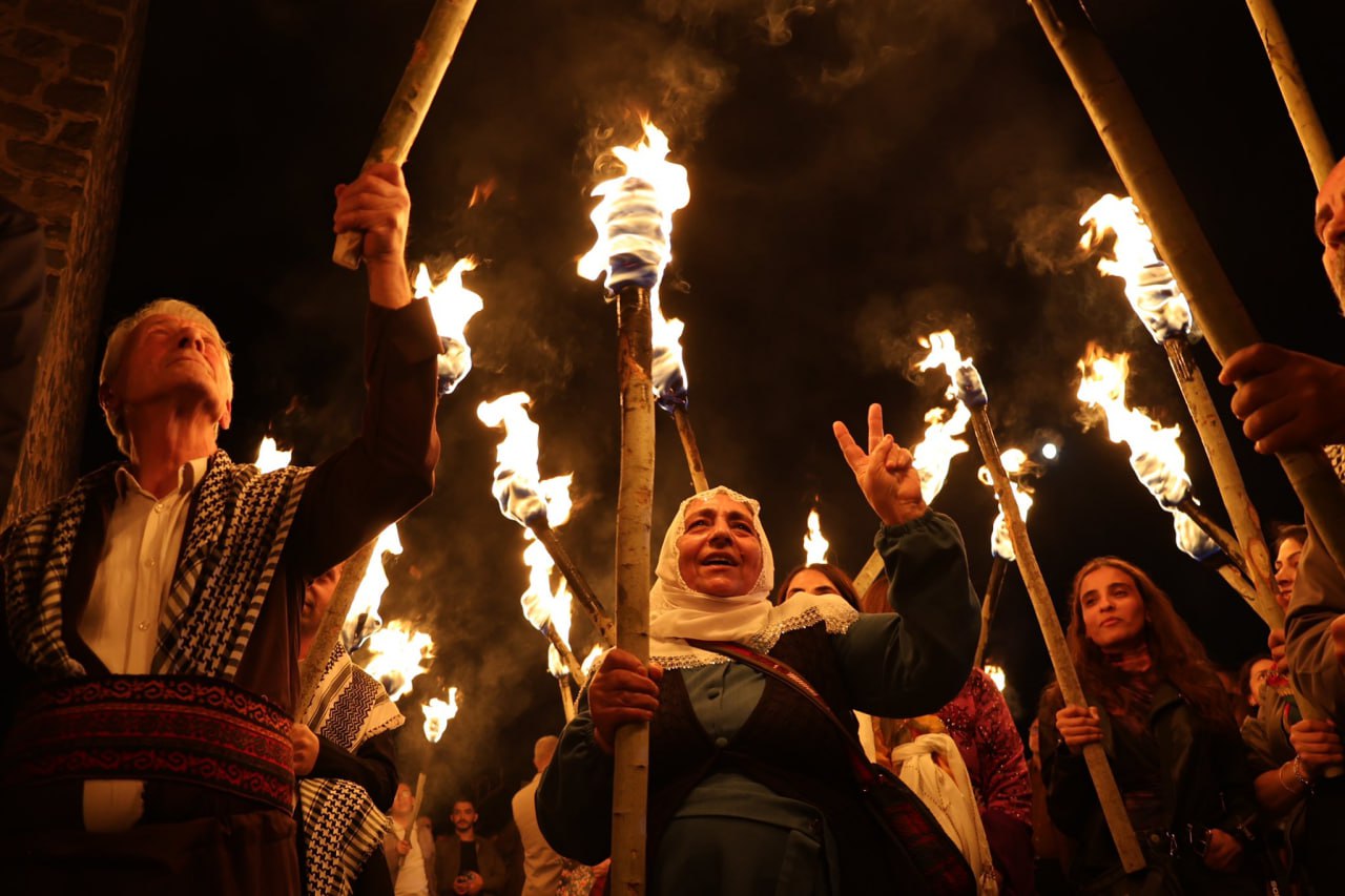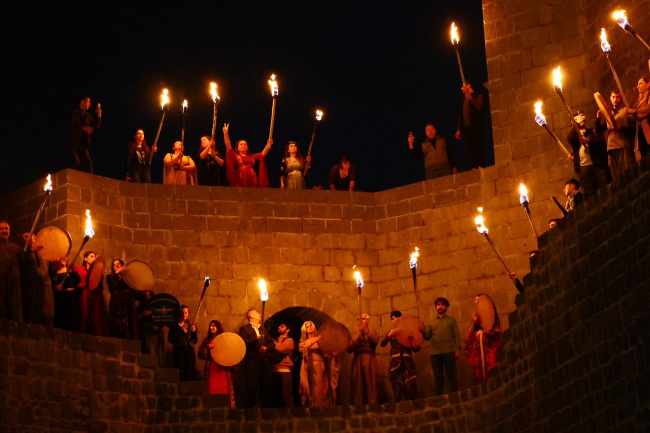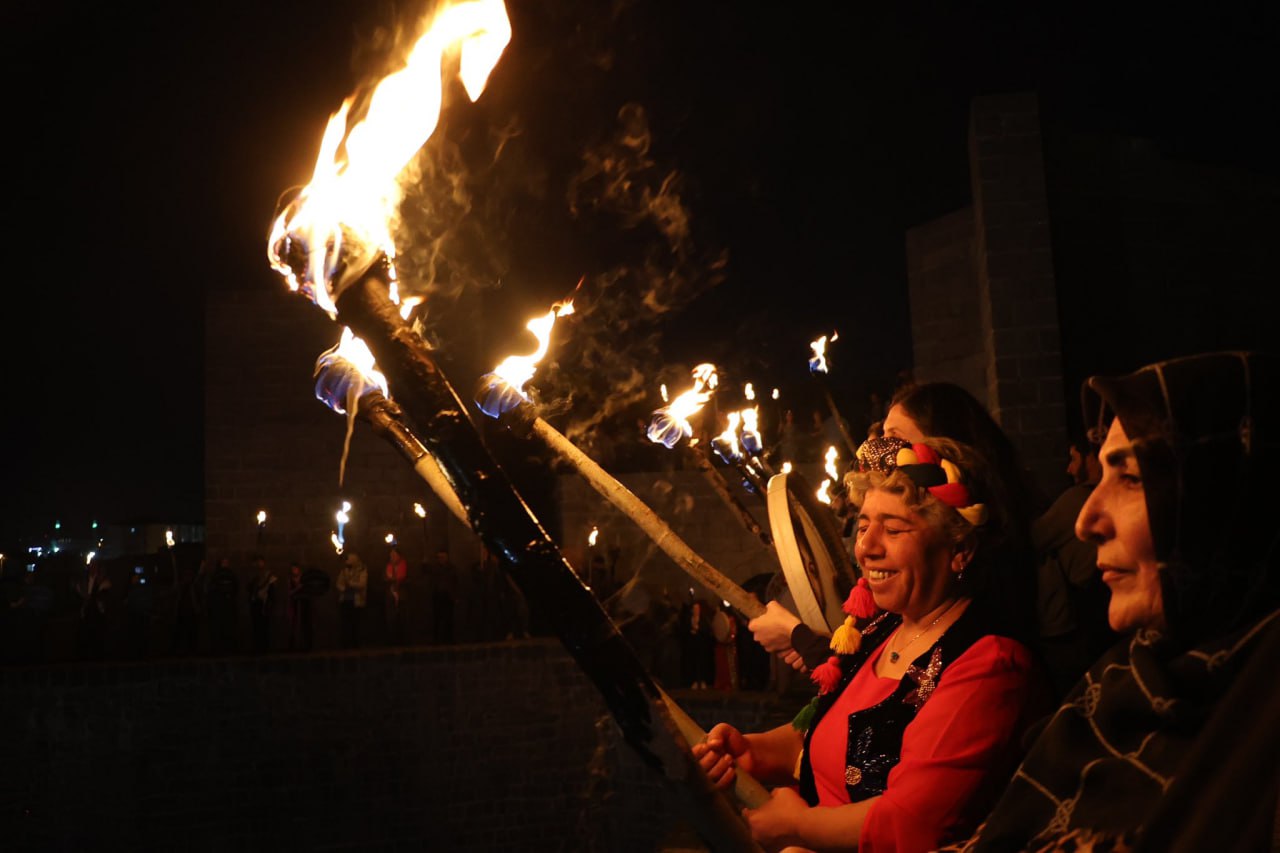 Uzun süre davul ve arbane eşliğinde halaya duran kitle, ardından meşale yakarak, stranlar seslendirdi. Ardından meşalelerle surlara çıkan kitle, sık sık, “Newroz pîroz be”, “Bê Serok jiyan nabe”, “PKK halktır, halk burada” ve “Bijî Serok Apo” sloganları attı. Kadınların zılgıtları ve “Jin, jiyan, azadî” sloganları surlarda yankılandı. Uzun süre surların üzerinde davul ve arbaneyle sloganlar atan kitle, Newroz şarkıları seslendirdi.