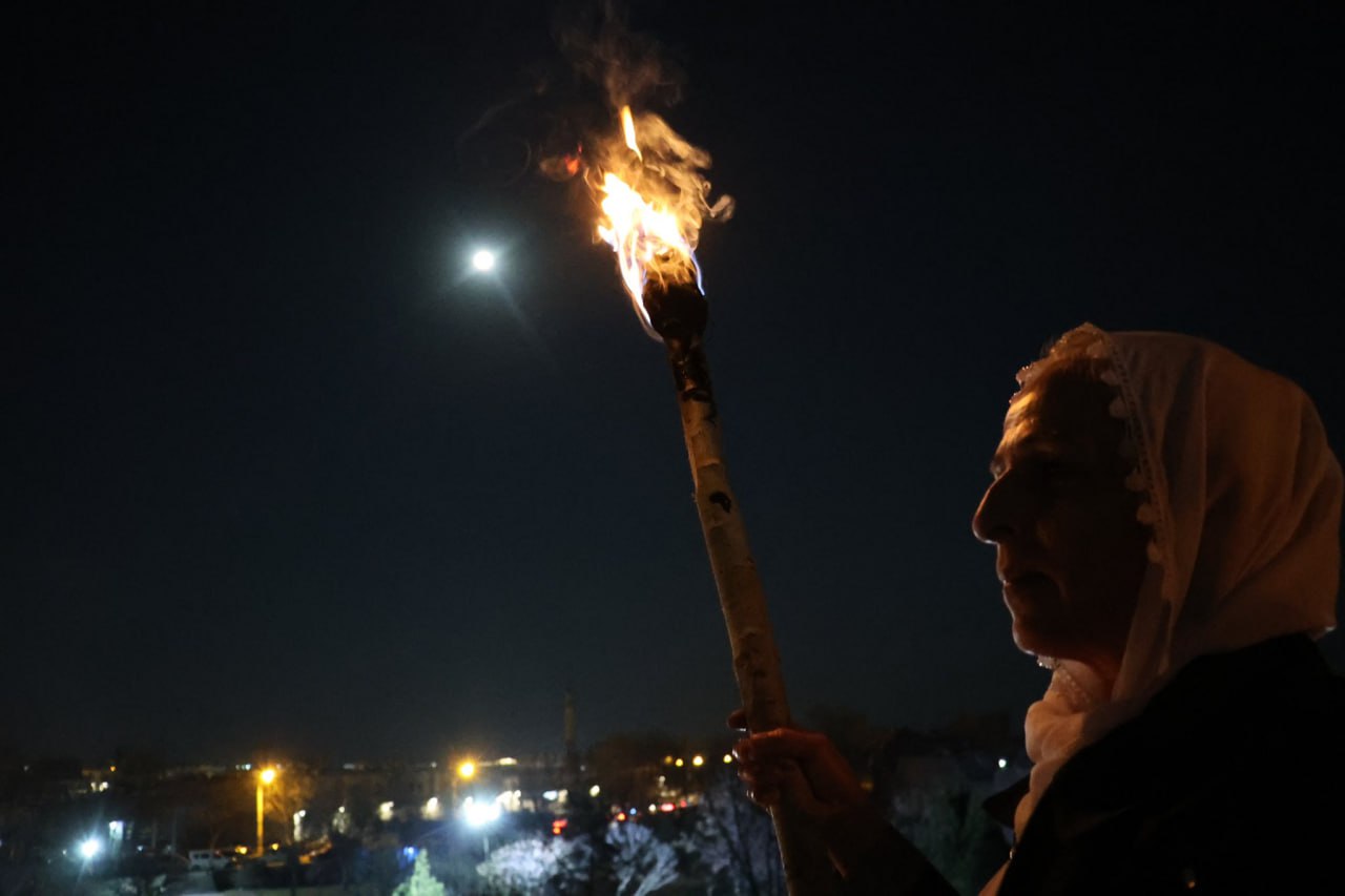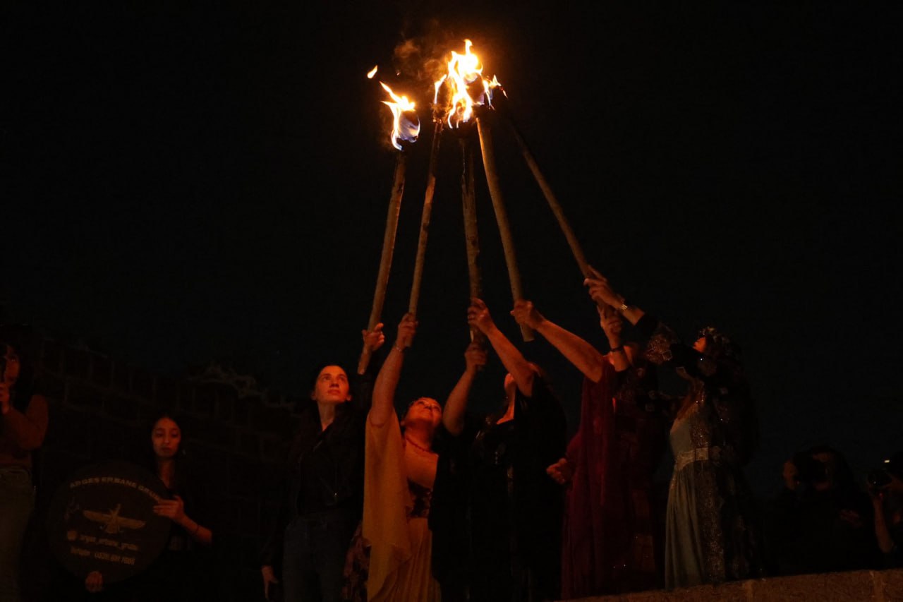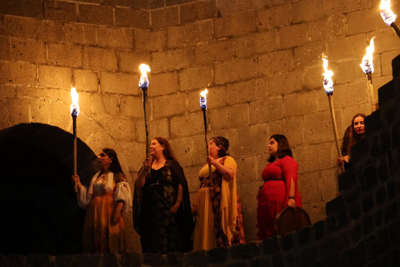 Uzun süre davul ve arbane eşliğinde halaya duran kitle, ardından meşale yakarak, stranlar seslendirdi. Ardından meşalelerle surlara çıkan kitle, sık sık, “Newroz pîroz be”, “Bê Serok jiyan nabe”, “PKK halktır, halk burada” ve “Bijî Serok Apo” sloganları attı. Kadınların zılgıtları ve “Jin, jiyan, azadî” sloganları surlarda yankılandı. Uzun süre surların üzerinde davul ve arbaneyle sloganlar atan kitle, Newroz şarkıları seslendirdi.