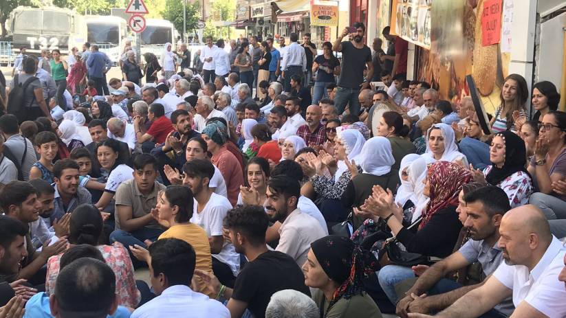 Şarkılarla başlayan oturma eyleminde, “Bijî berxwedana Amed ê”, “Bijî berxwedana Mêrdîn ê/ Wan ê”, “AKP halka hesap verecek”, “Kayyımlar gidecek, biz kalacağız”, “Gün gelecek devran dönecek, hırsızlar halka hesap verecek” sloganları atılıyor.