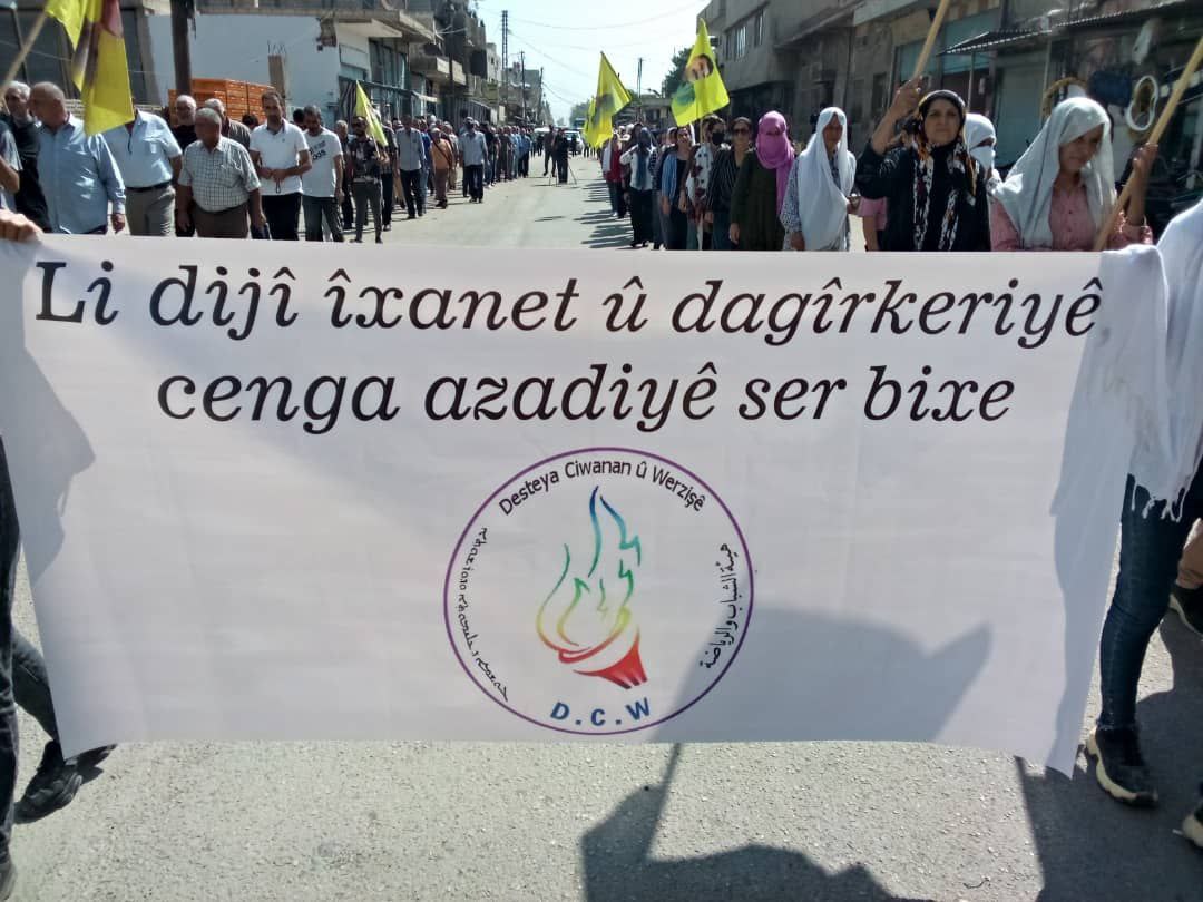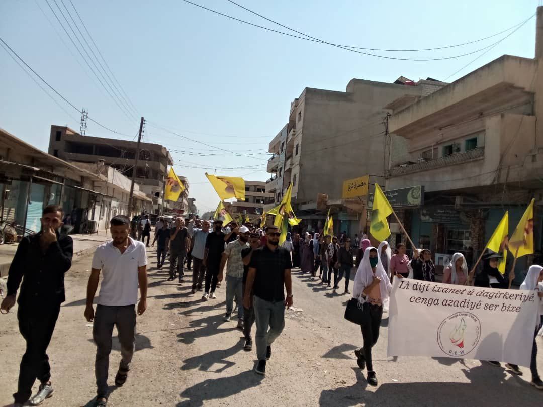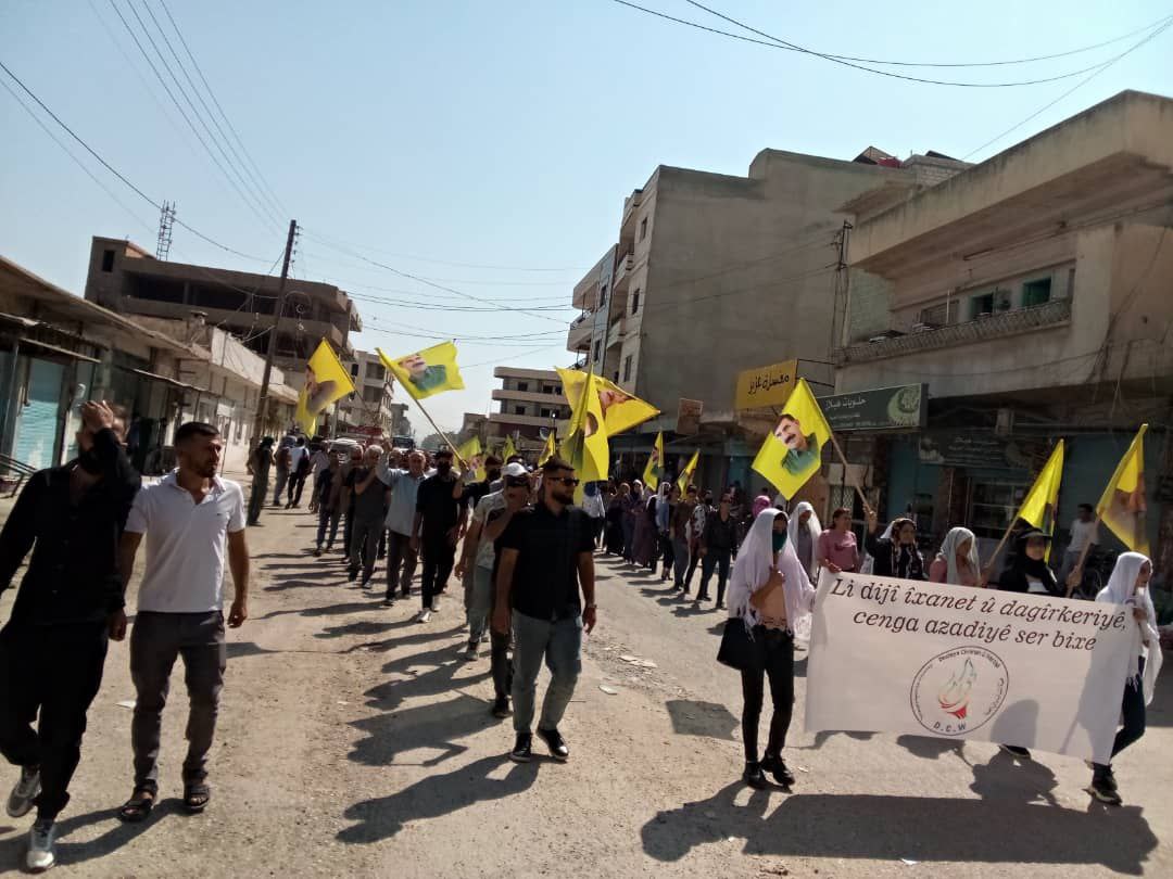 AMÛDÊ- Amûdê Devrimci Gençlik Hareketi ve Genç Kadınlar Birliği önclüğünde “Önder APO’ya Özgürlük Kürt Sorununa Çözüm” hamlesi kapsamında  “İhanete ve İşgale karşı Özgürlük Savaşını Kazanalım” sloganıyla kitlesel bir yürüyüş gerçekleştirildi.
