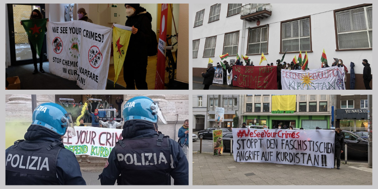 Başkent Roma’da Türk Konsolosluğu Kültür Ofisi önünde yapılan bir eylemde işgalci Türk devletinin gerillaya yönelik kimyasal silah kullanımı ve Rojava’ya yönelik işgal saldırıları protesto edildi.