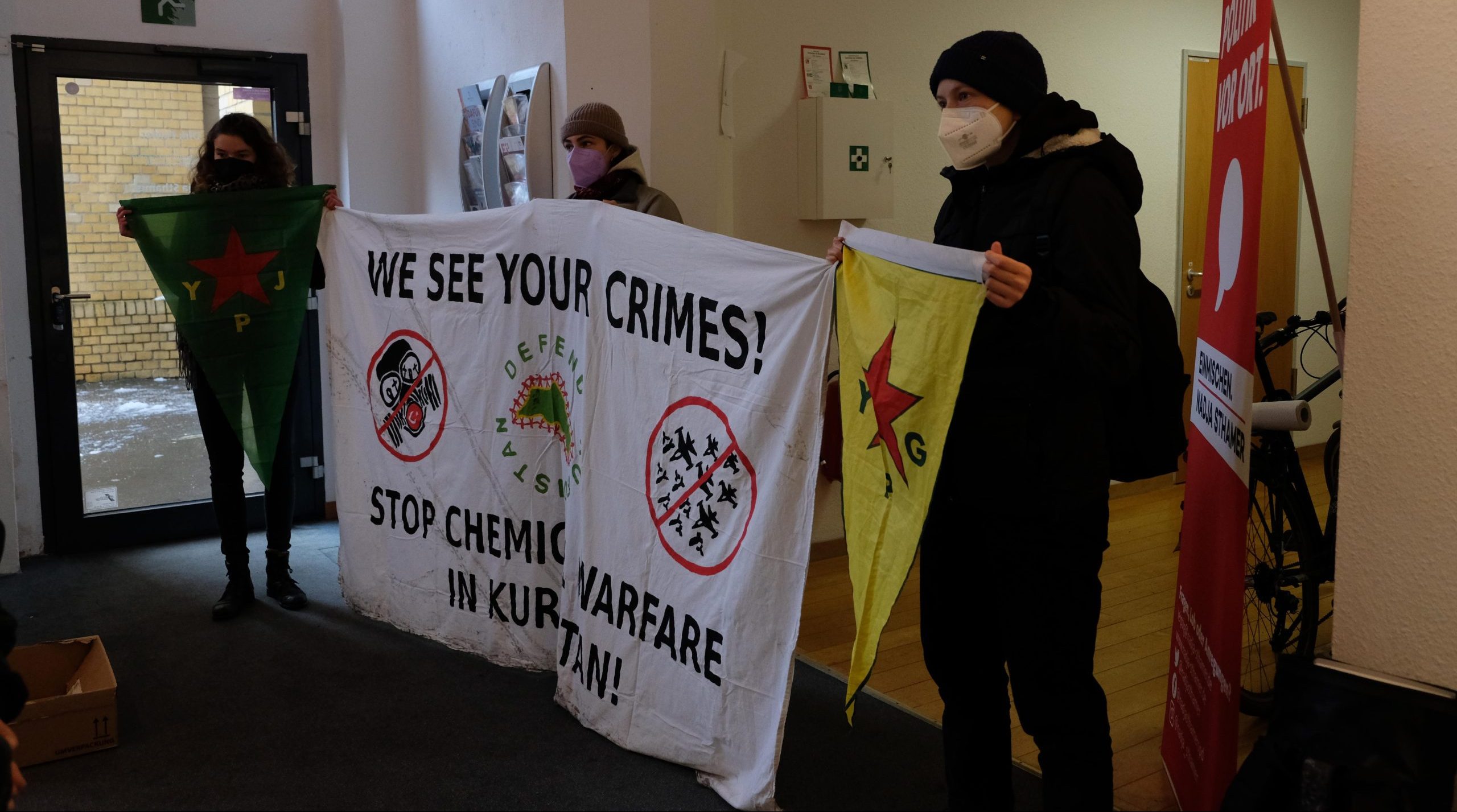 EndFossil:Occupy! ve Lützi-Berlin-Vernetzung gibi çeşitli gruplardan üyeler yaratıcı yöntemler kullanarak, işgalci Türk devletinin Kurdistan’da kimyasal silahlar ve yasaklı bombalarla gerçekleştirdiği ve Suriye’nin kuzeydoğusundaki Rojava’daki sivil bölgelere de yönelttiği saldırılara dikkat çekti. Yeşiller Partisi genel merkezi önünde, bir suç mahallini tasvir ederek Türk hükümetinin suçlarının ifşa edildiği bir performans sergilendi.