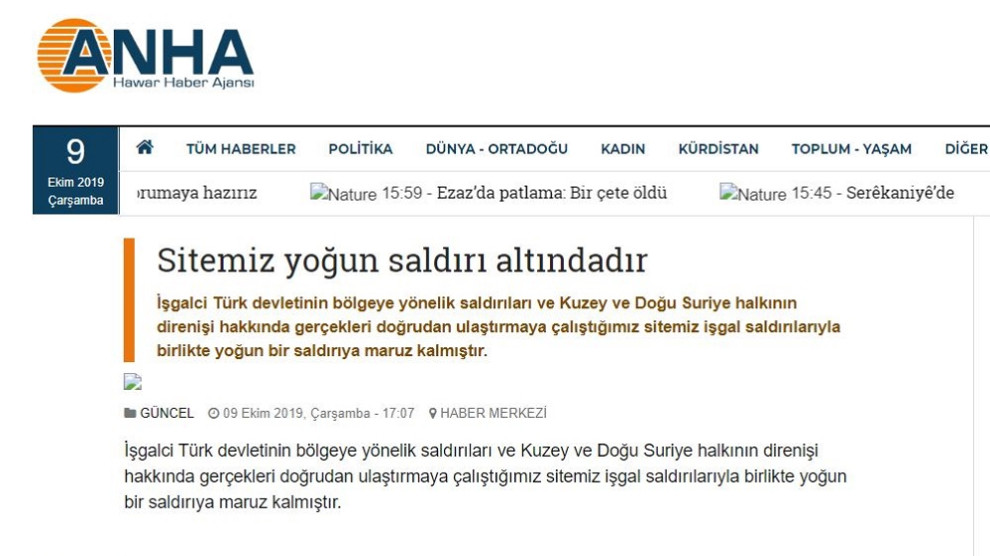 HABER MERKEZİ – Yazılı bir açıklama yapan Hawarnews, Türk devletinin Kuzey ve Doğu Suriye’ye yönelik başlattığı işgal saldırıları ile birlikte ajanslarının yoğun bir saldırıya maruz kaldığını belirtti.