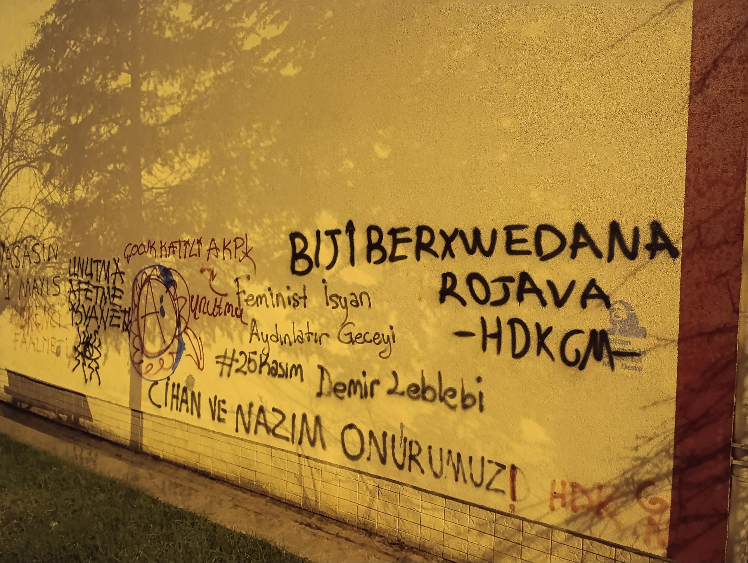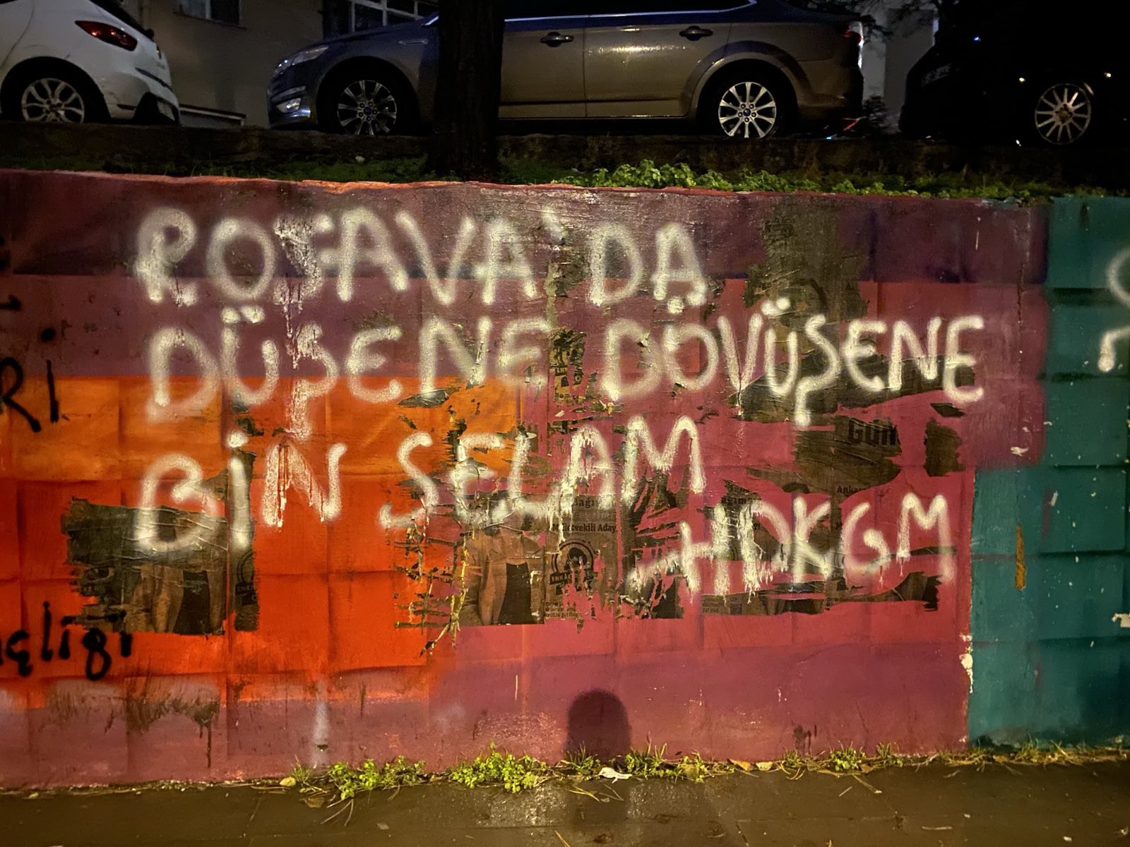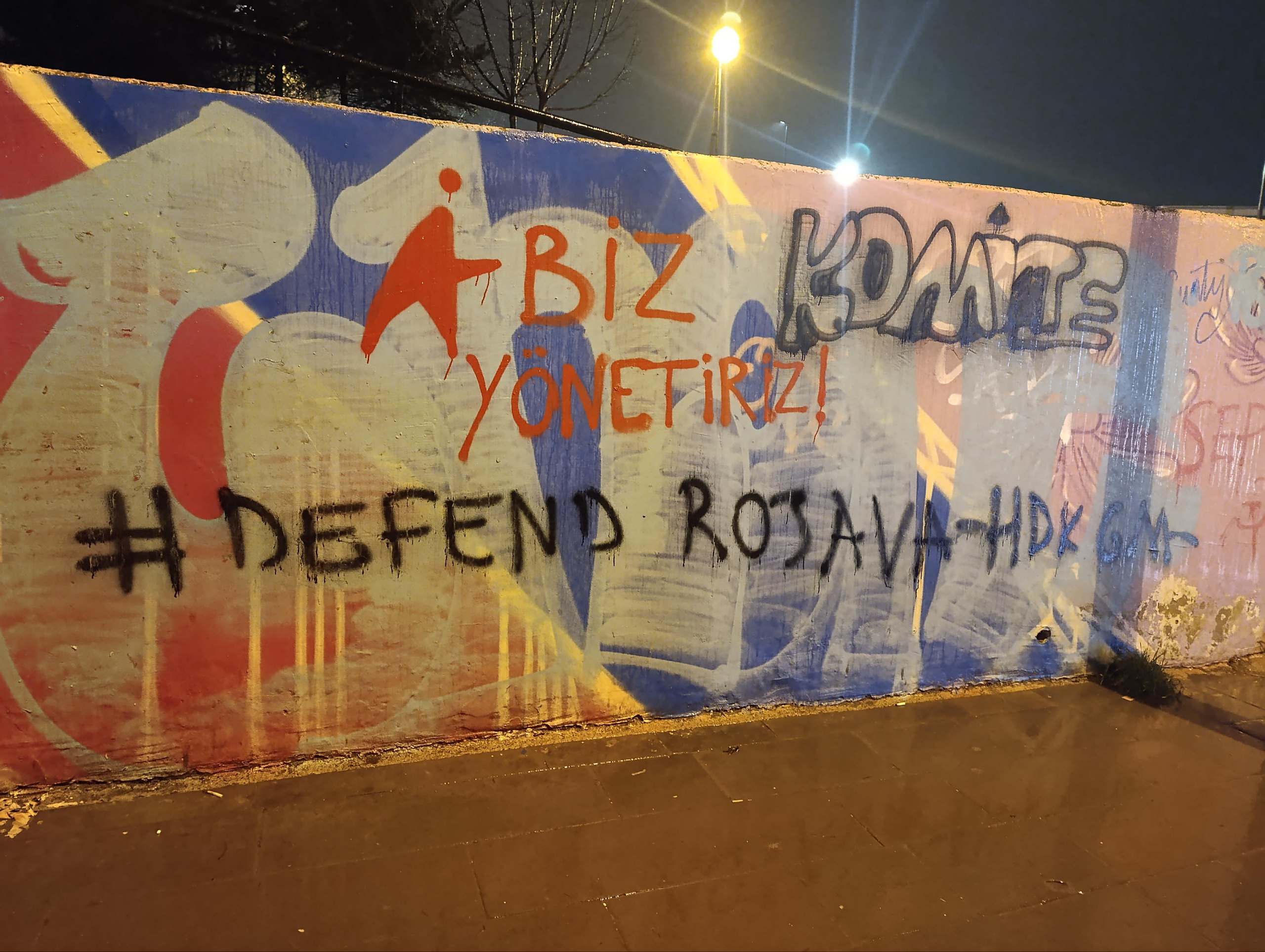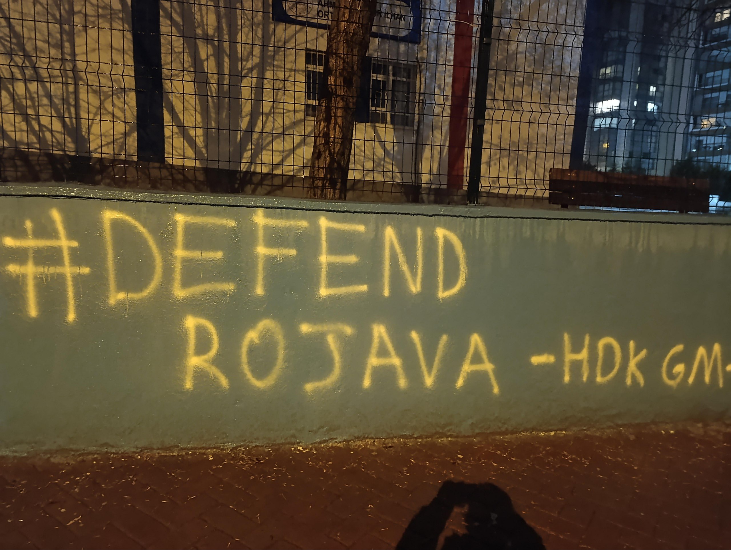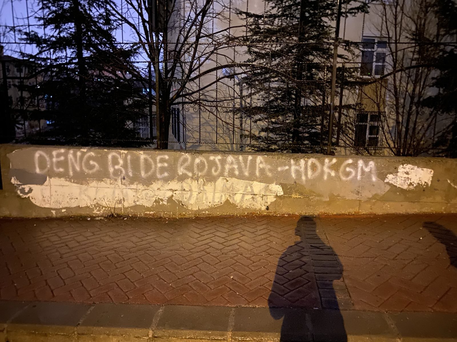 ANKARA – Halkların Demokratik Kongresi (HDK) Ankara Gençlik Meclisi, Rojava’da devam eden saldırılara dikkat çekmek amacıyla Ankara’nın 100. Yıl Mahallesi’nde yazılama çalışması gerçekleştirdi. Yapılan çalışmada bölgedeki saldırılara karşı dayanışma çağrısı yapıldı.