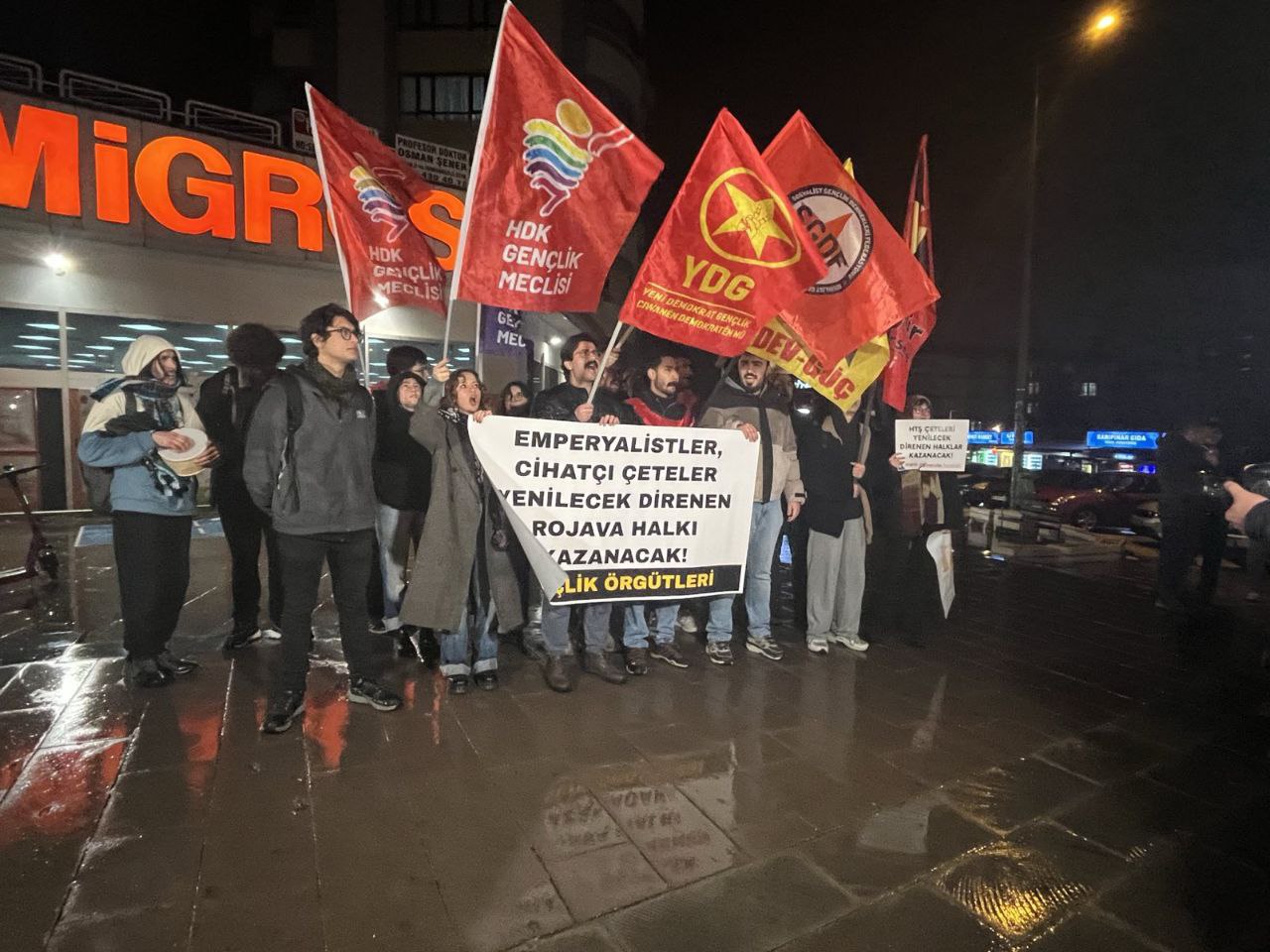 ANKARA – Ankara’nın Çankaya ilçesi 100. Yıl Mahallesinde bir araya gençlik örgütleri, HTŞ-DAİŞ ve Türk devletine bağlı çetelerin Rojava’ya dönük saldırılara karşı yaptıkları bansın açıklaması ile protesto etti. Gençler açıklamada Rojava halkıyla dayanışma mesajları vererek ve Rojava’yı savunmayı bir görev olduğunu belirterek şehir şehir sokak sokak mücadeleyi örmeye ve büyütmeye devam edeceklerinin vurgusunu yaptı.