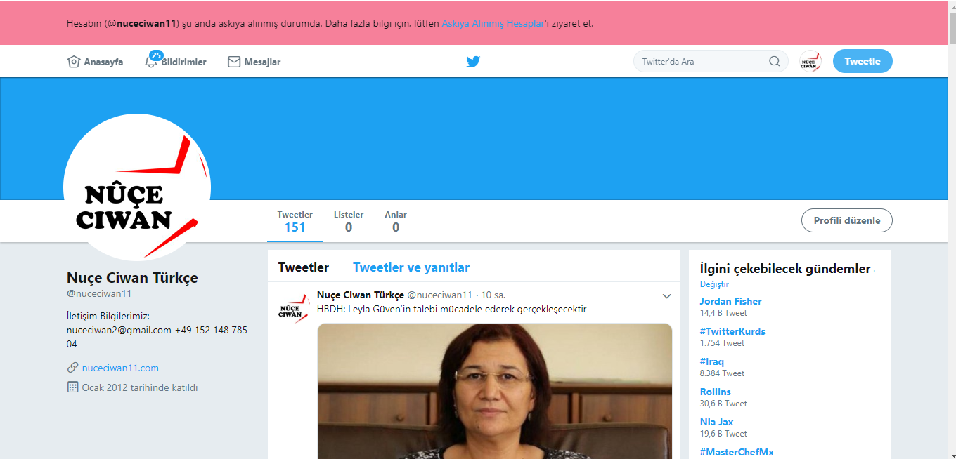 HABER MERKEZİ – Kapatılan hesaplara alternatif olarak açılan “@nuceciwan11” twitter hesabı da, işgalci Türk yetkili kurumlarının saldırısına uğrayarak erişime engellendi.