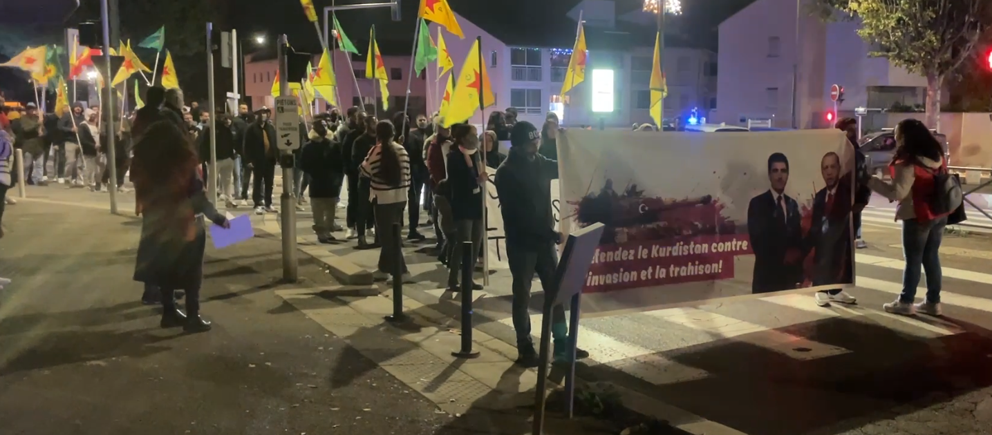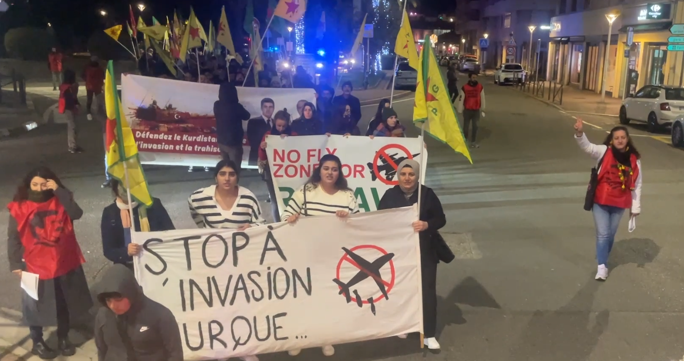 Eylemde “No fly zone for Rojava” (Rojava’ya karşı hava sahasını kapatın) ve “Stop a L’invasion Turqe” (Türk işgalini durdurun) yazılı pankartlar ve PKK, YPG ve YPJ bayrakları açıldı.