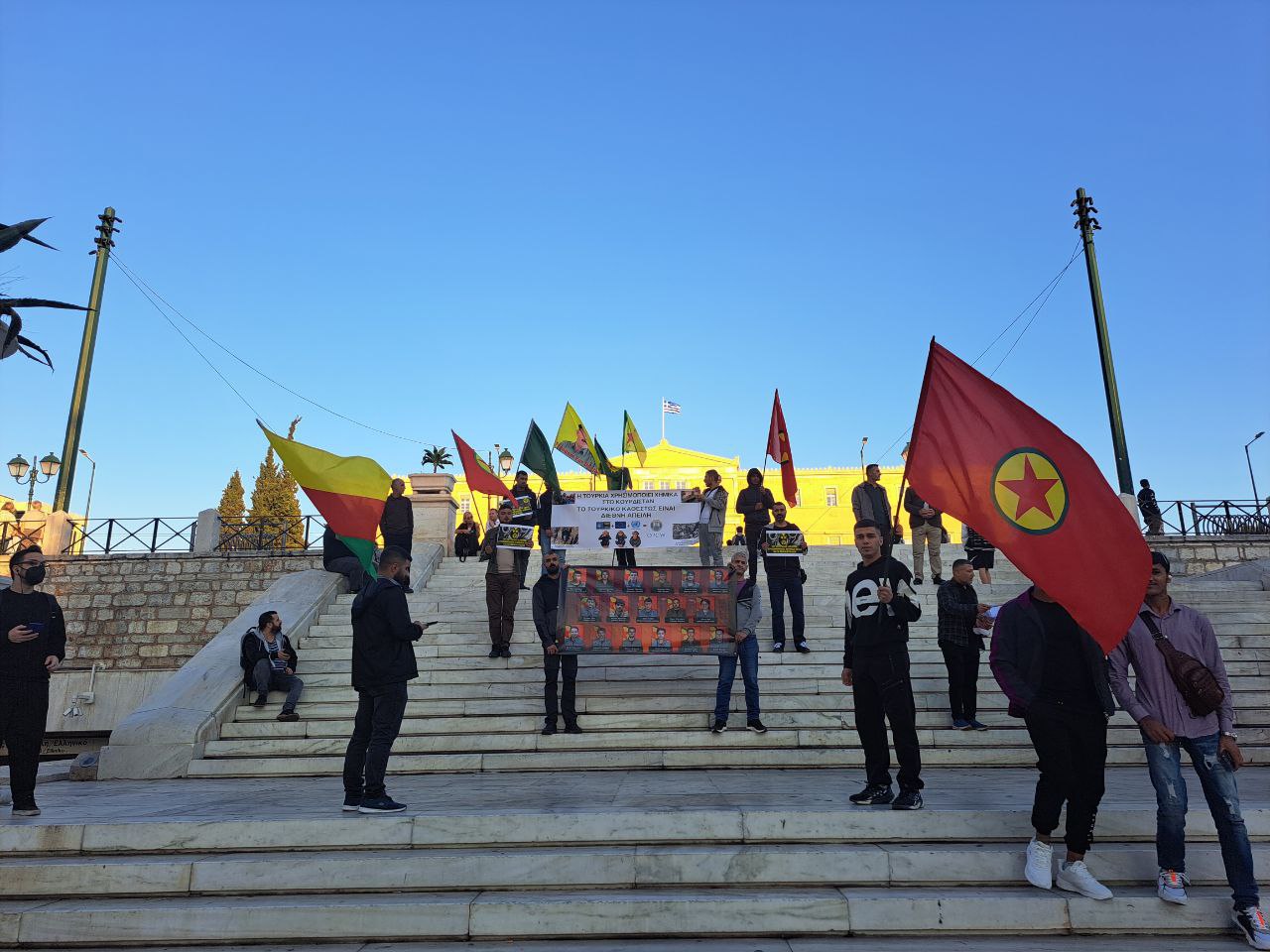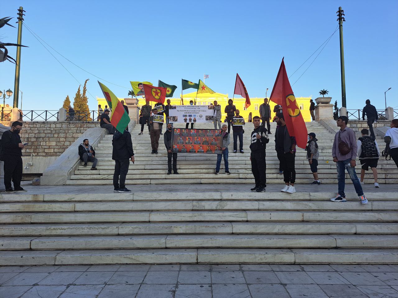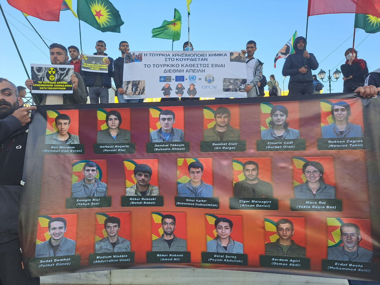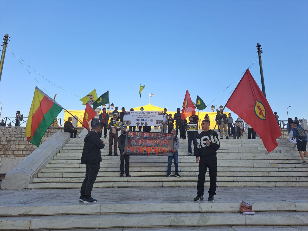 “Ciwan Fedaiyê Reber Apo’ne” , “Zap, Avaşin, Metina Berxewedana Gerilla” ve Yunanca sloganlar atılan eylem büyük ilgi görürken enternasyonaller de eylemi destekledi.