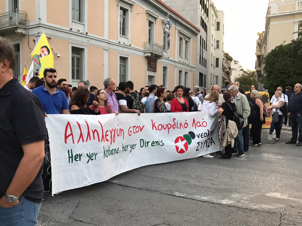 ATİNA – Yunanistan’ın başkenti Atina’da bulunan Türk konsolosluğu önünde gerçekleştirilen kitlesel eylem ile Türk devletinin Rojava’ya dönük işgal saldırıları protesto edildi. Kürdistan Gençlik İnisiyatifi ve Syriza Gençlik Meclisi’nin çağrısı ile bir araya gelen yüzlerce genç, açtıkları pankart ve bayraklar ile Türk konsolosluğu önünde açıklama yaptı.
