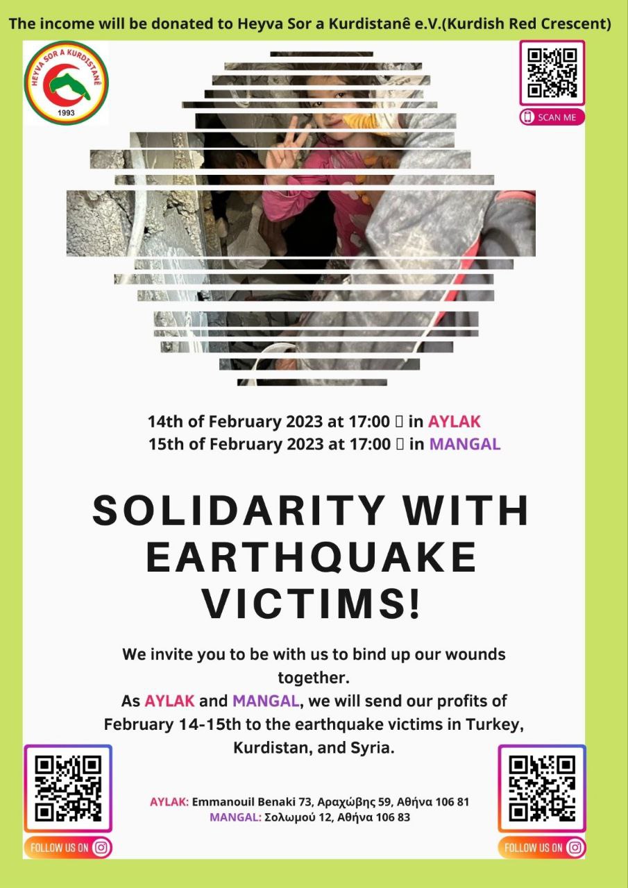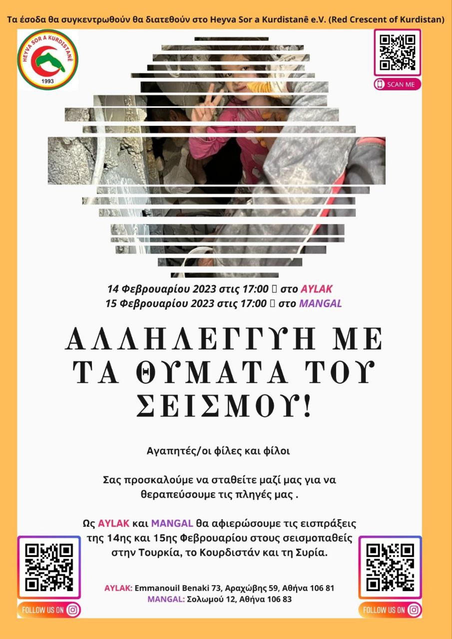 Yunanistan da yaşayan Kürtler Heyva Sor Kurdistan’ın başlattığı kampanyaya destek için bir dizi etkinlik örgütlüyor. Kurdistanlılar ve Yunan halkı Heyva Sor’un çağrısına büyük bir destek veriyor.Atina’da bulunan Aylak Restaurant bugün, Mangal Restaurant ise yarın, kazanacakları tüm geliri Heyva Sor’a bağıslıyor. Ayrıca Kürt gençleri kentin birçok yerinde afiş çalışmaları yaparak kampanyayı büyütmeyi hedefliyor.