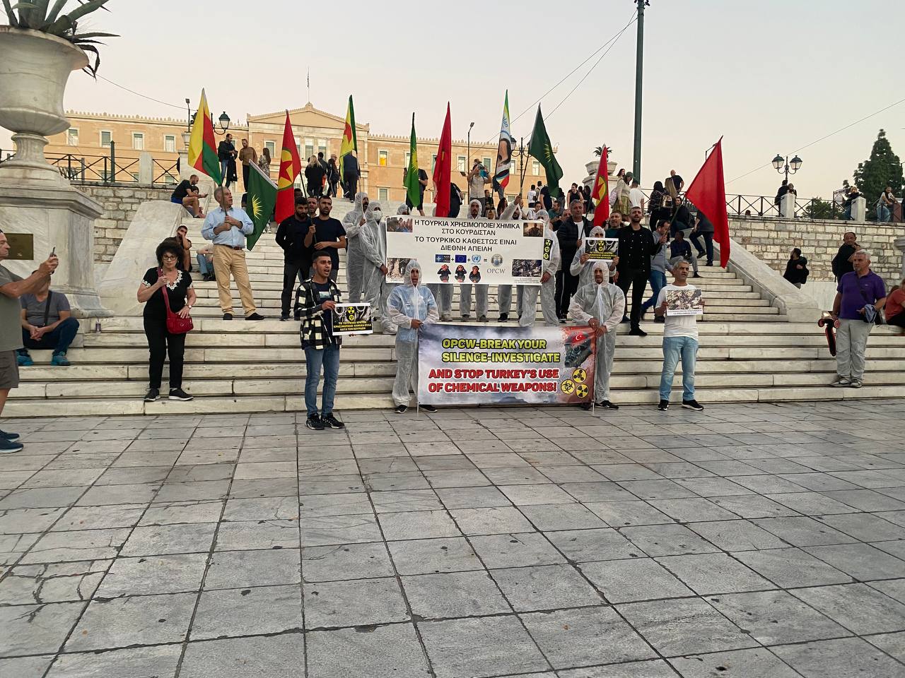 Faşist TC devletinin Kürdistan özgürlük gerillasına karşı kullandığı kimyasal silahları ve yaşanan insanlık suçunu kınamak ve lanetlemek için Atina’nın en kalabalık yerlerinden biri olan Sintegma alanında eylem gerçekleştirildi. TCŞ öncülüğünde yapılan eylemde TC devletinin yaşanan insanlık suçunu ve uluslararası devletlerinin sessiz kalınmasına tepki gösterdi. Halkın yoğun ilgi gösterdiği eylemde sık sık “Biji Berxwedana Gerilla” , “Biji Berxwedana Zape” , “Biji Serok Apo” sloganları atıldı.