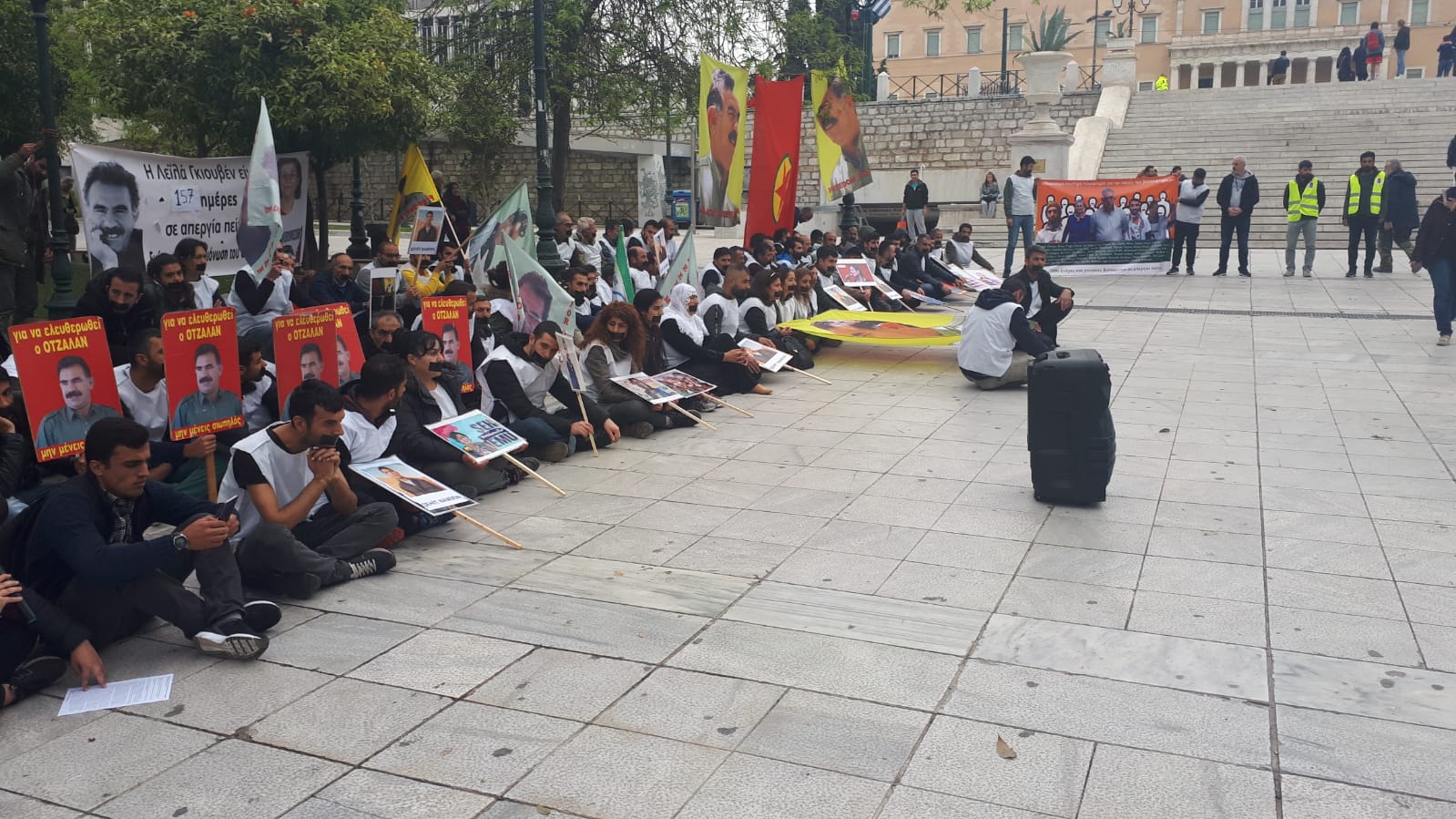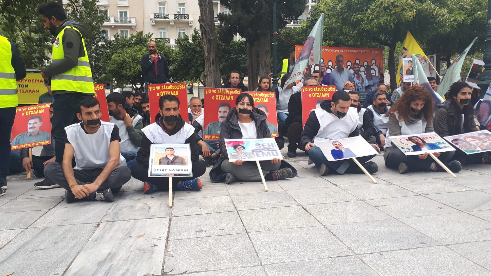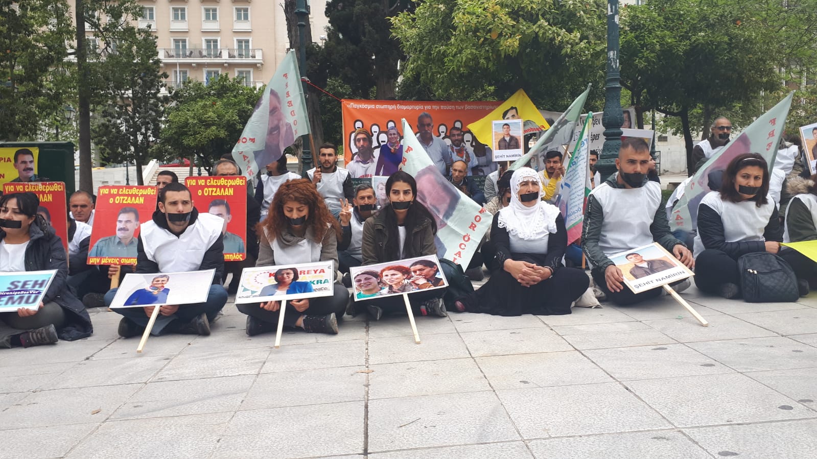 ATİNA – Beyaz yeleklerle oturma ve sessizlik eylemi yapan kitle, yüzlerine siyah bant çekerken, Avrupa, Kürdistan ve dünyada binlerce kişinin tecridin son bulması amacıyla grevde olduğuna dikkat çekildi.
