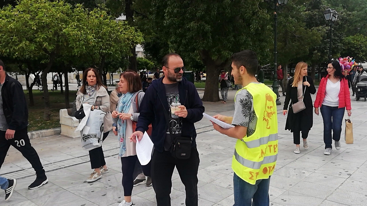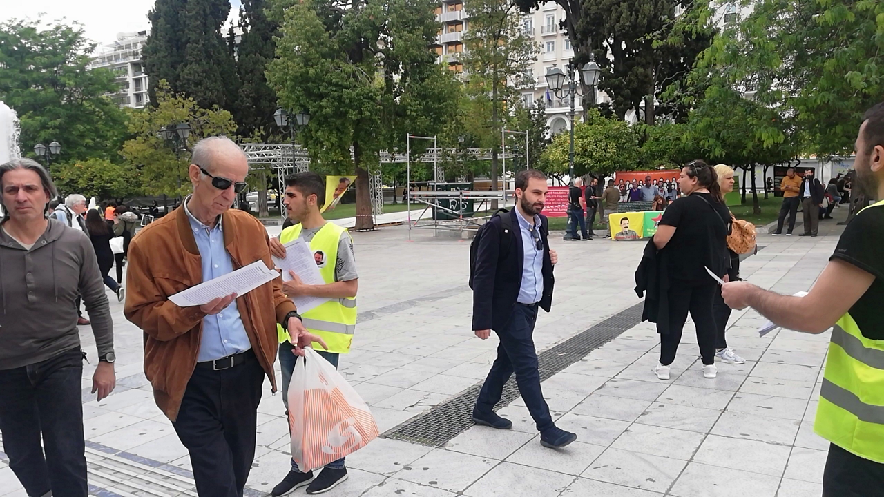 Bir çok Kürt ve Türkiyeli sol örgütlerin katıldığı eylem kapsamında, meydanda bir çadır kuruldu. Halklar Önderi Abdullah Öcalan Öcalan’ın posteri ile PKK, KCDK, HBDH ve HPG bayrakları çadıra asıldı. Eylem alanına ayrıca açlık grevi eylemcilerinin fotoğraflarını yer aldığı bir pankart dikkat çekti. Yunanca ve İngilizce bildirilerin dağıtıldığı eyleme, çevredekilerin yoğun ilgisi gözlendi.