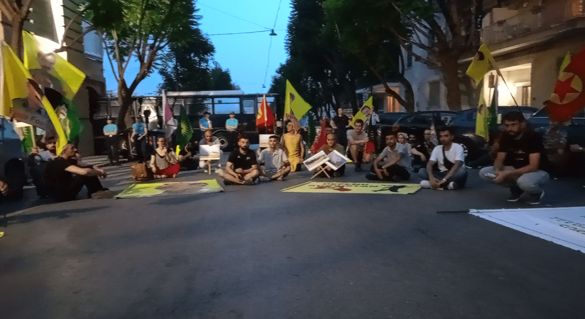 Basın açıklaması ardından, oturma eylemi gerçekleştiren eylemciler “Bijî Serok APO”, “Bê Serok Jiyan Nabe” ve “Bi Can Bi Xwîn Em Te Re Ne Ey Serok” sloganları atarak eylemlerini sonlandırdı.