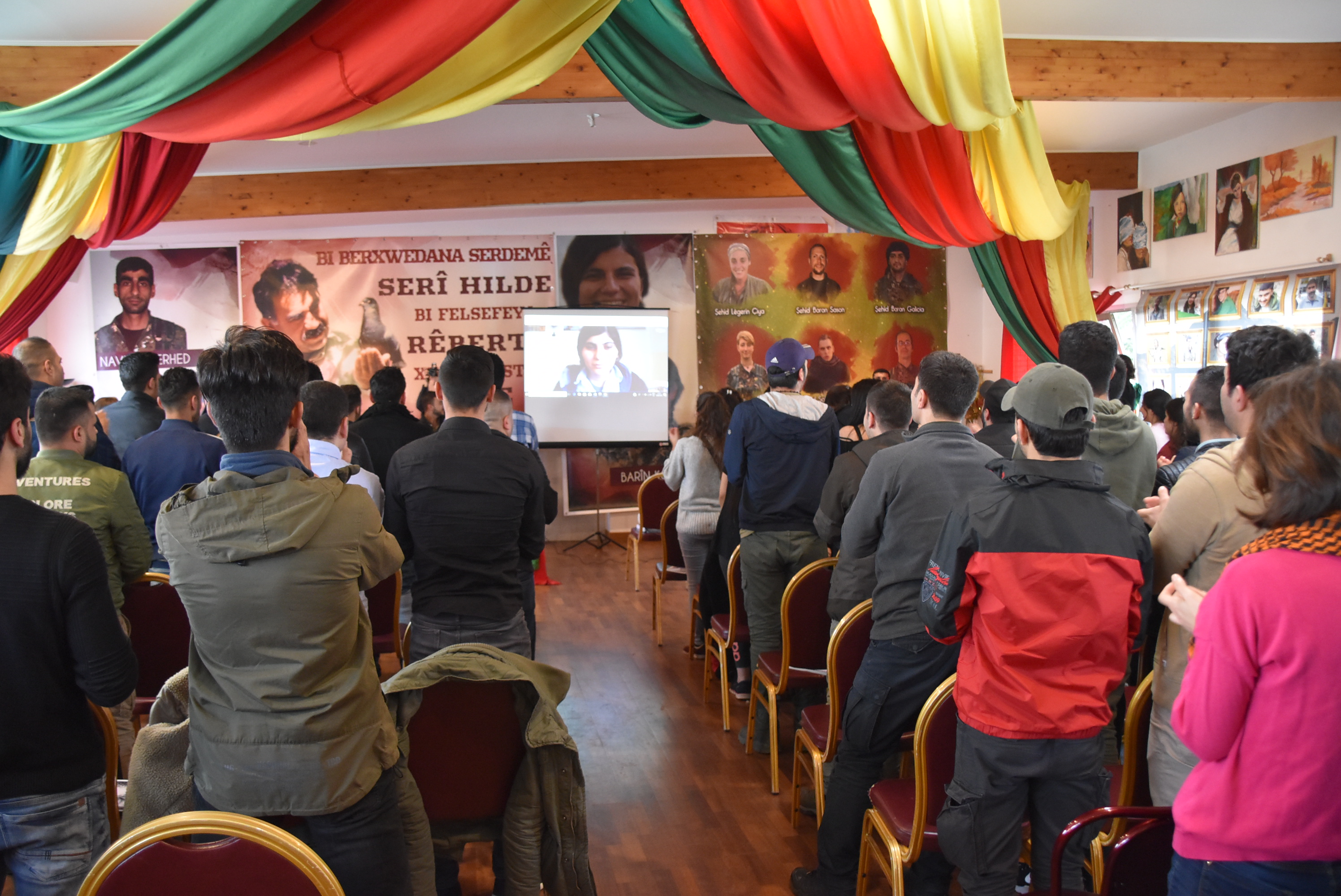 Konferansın, Yekîtiya Ciwanên Rojava üyesi Jinda Botan’a skype üzerinden bağlantısı ise; salonda coşkulu sloganlarla karşılandı. Botan, Efrîn direnişinde gençliğin rolü ve Serî Hilde Hamlesi’ni değerlendirerek konferansı kutladı.