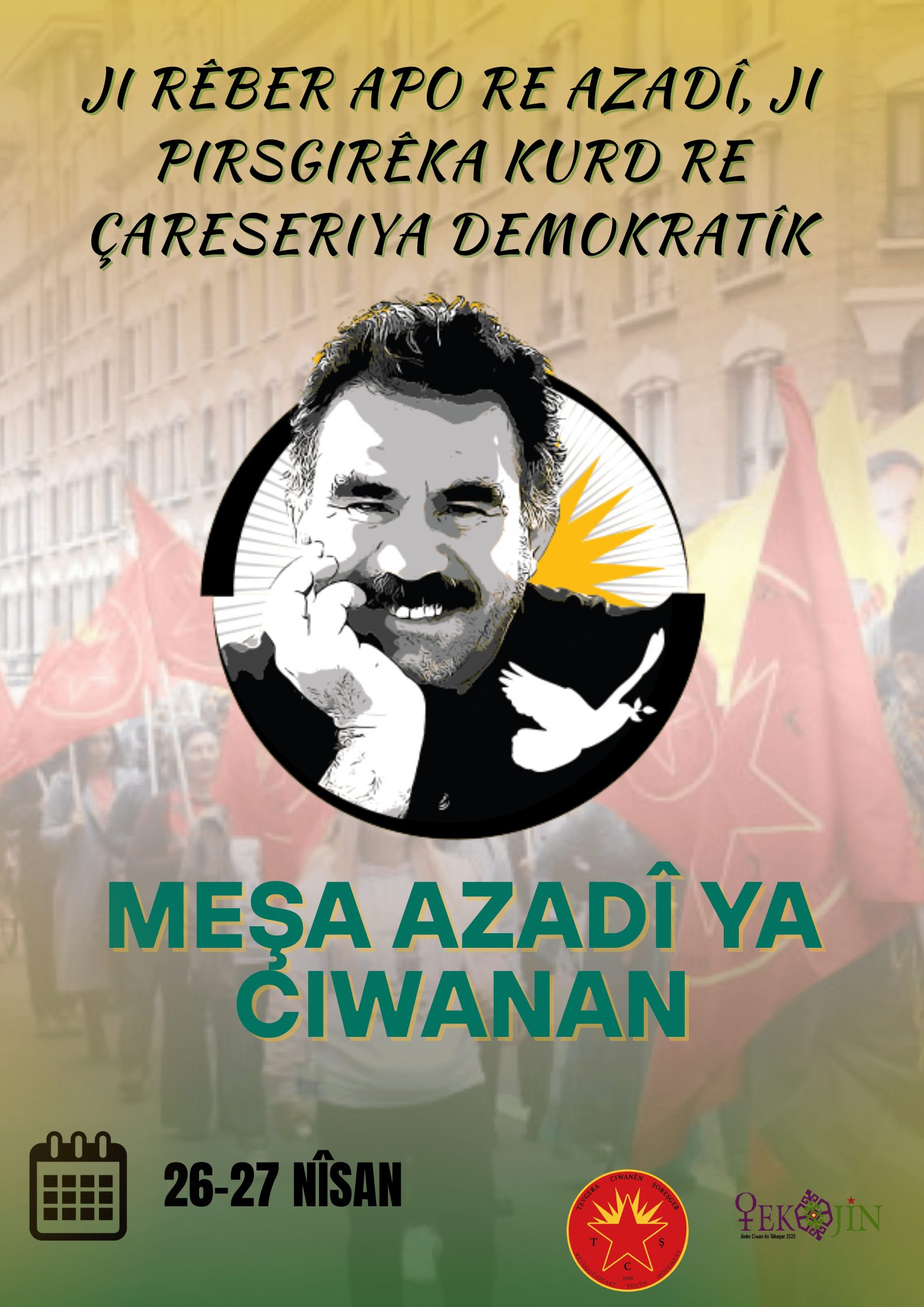Önderliğin fiziki özgürlüğü, özgür Kürdistan’ın ve onurlu barışın ön şartıdır. Biz bu iradeyi alanlara taşıyacağız. 26-27 Nisan’da meydanlar gençliğin kararlılığıyla yankılanacak, APOCU ruh her yerde bayraklaşacak! Avrupa sokaklarında Önder APO’nun fiziki özgürlüğü için buluşuyoruz Özgürlük yürüyüşümüz Önder APO özgürleşene dek sürecek!