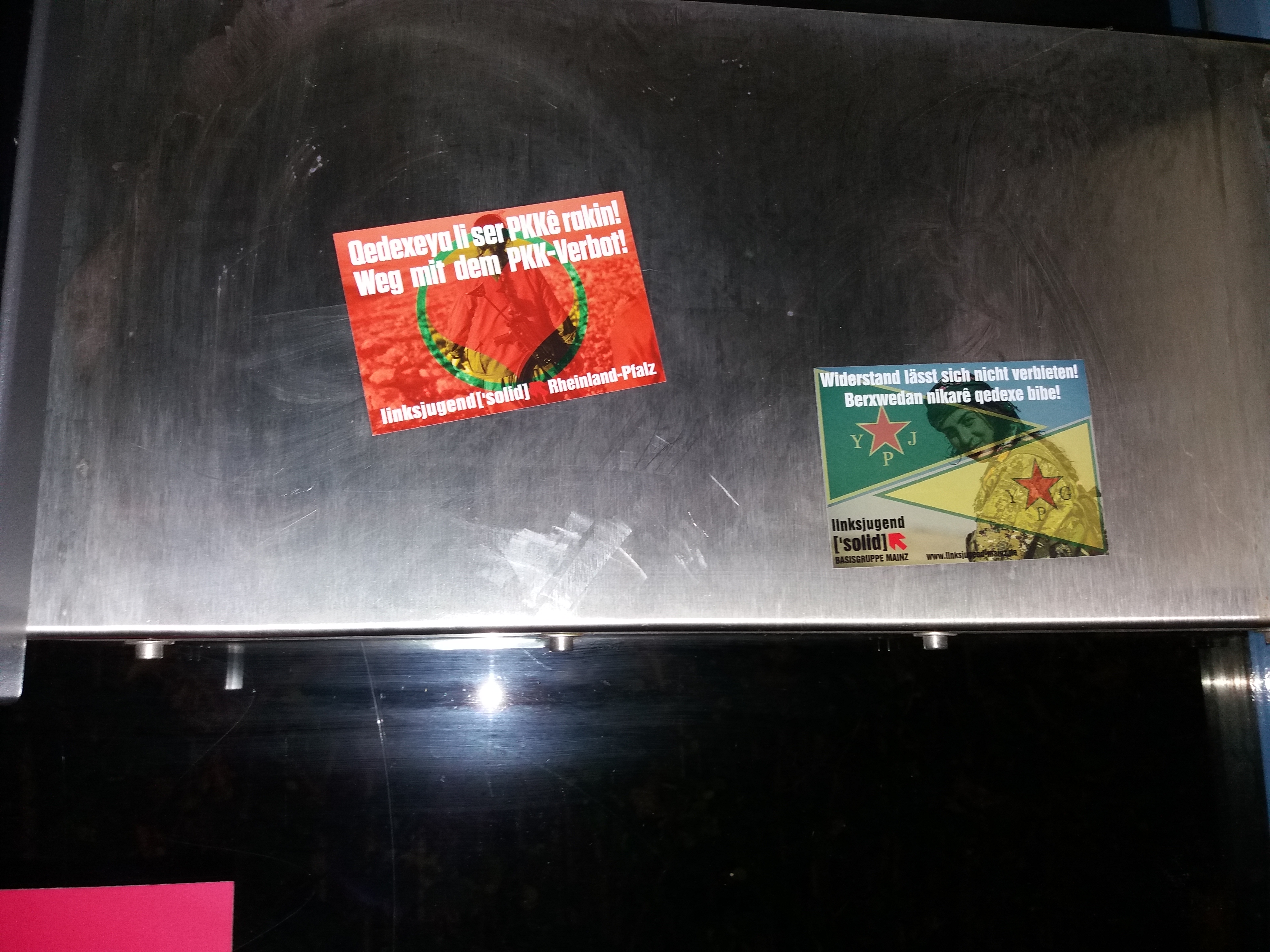 Yine Almanya’nın Darmstadt şehrinde ise genç kadınlar merkezi bir yol üzerinde bulunan bir üst geçidin üzerine büyük bir pankart astılar. Genç kadınlar, üzerine PKK bayrağı boyadıkları pankartın üzerine Almanca “1978 – 2018 Yaşasın PKK” yazdı.