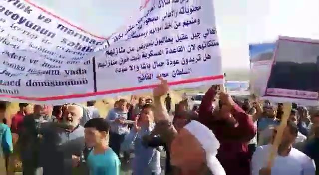 Türkçe ve Arapça “Türk ordusu Şêx Eqîl Dağı halkının evlerini yıktı. Halk evsiz kaldı. Paralarını ve mülkiyetlerini almaları yasaklandı. Evlerinin yerine askeri üs yapılan Şêx Eqîl Dağı halkı tazminatını istiyor. Cemal Paşa’nın ya da Fatih Sultan Mehmet’in dönüşünü mü istiyorsunuz” yazılı büyük bir pankart da taşındı.