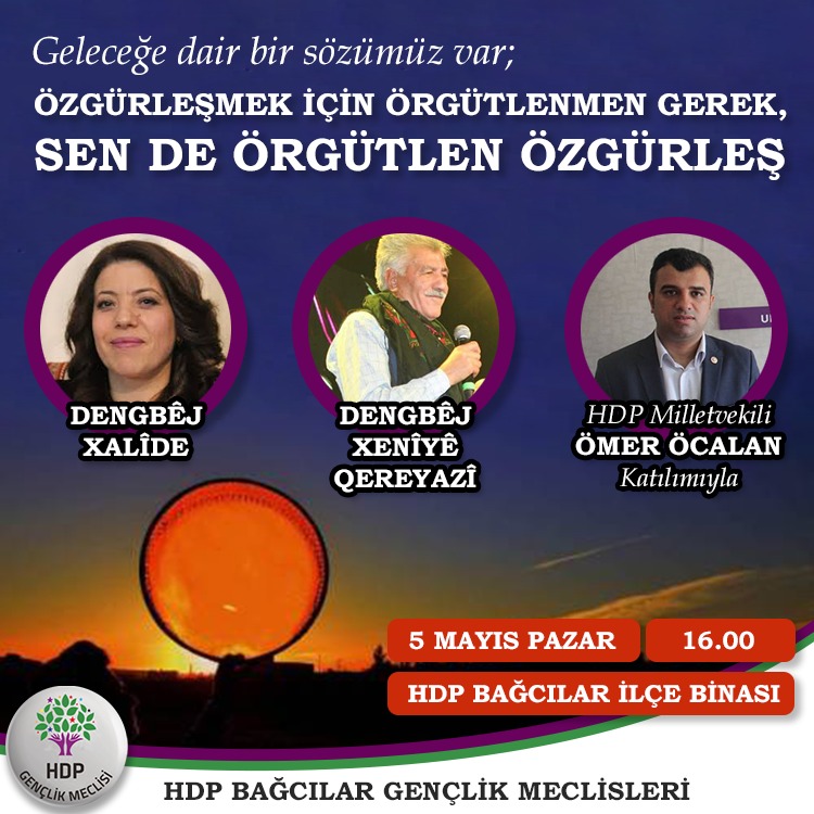 Halkların Demokratik Partisi Milletvekili Ömer Öcalan’ın da katılacağı etkinlik 5 Mayıs Pazar günü saat 16:00’da HDP Bağcılar ilçe binasında gerçekleşecek. Etkinliğe Dengbêj Xalide ve Dengbêj Xeniye Qereyazî katılıyor.