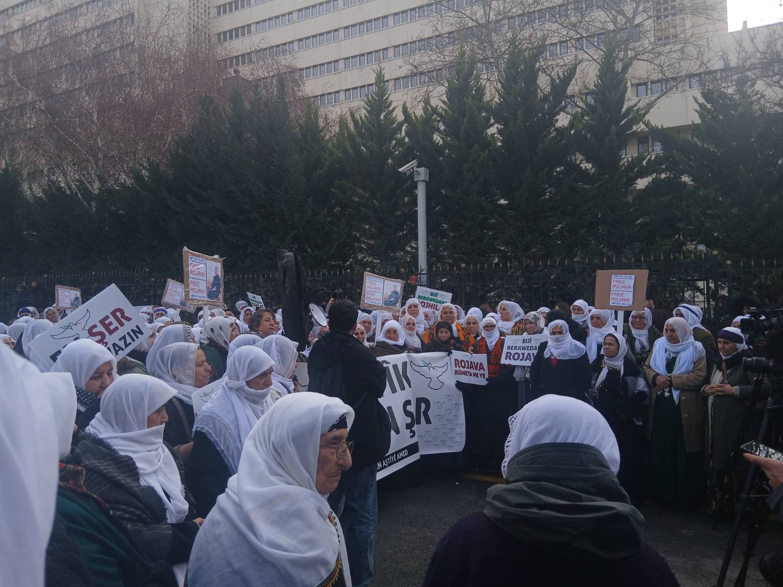 HTŞ çetelerinin Halep’in Şêxmeqsûd ve Eşrefiyê mahallerine yönelik saldırılarına ilişkin Kürdistan ve Türkiye’de bulunan Barış Anneleri dün Ankara’ya doğru yola çıkmıştı. Sabah saatlerinde Ankara’ya varan Barış Anneleri Sayıştay önünde bir araya geldi. Dışişleri Bakanlığı’nın önüne gelmek isteyen çok sayıda annenin geldiği araç polisler tarafından Sayıştay’ın önünde kesildi.