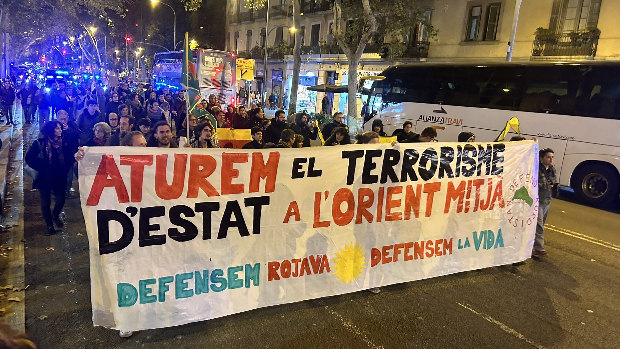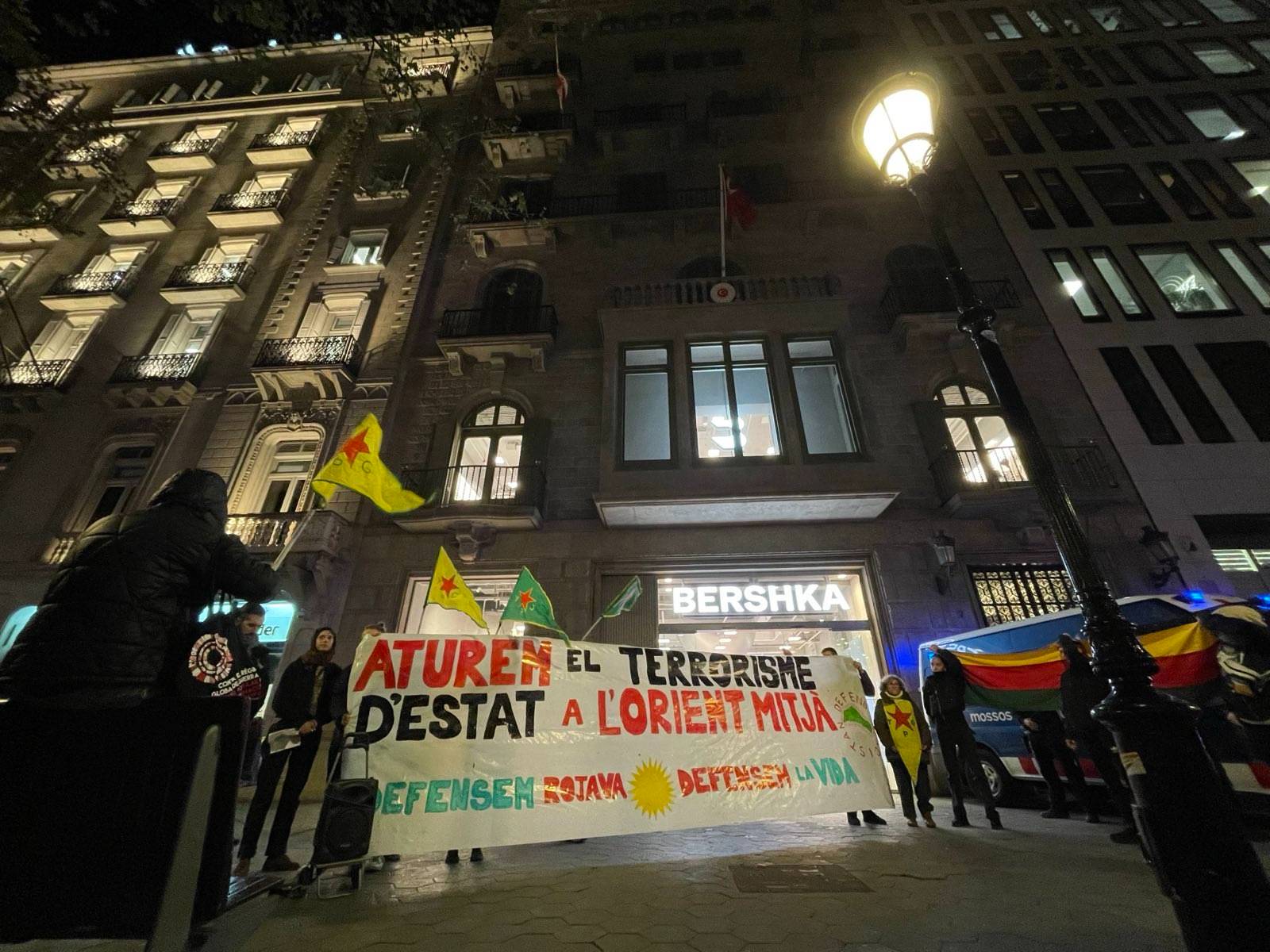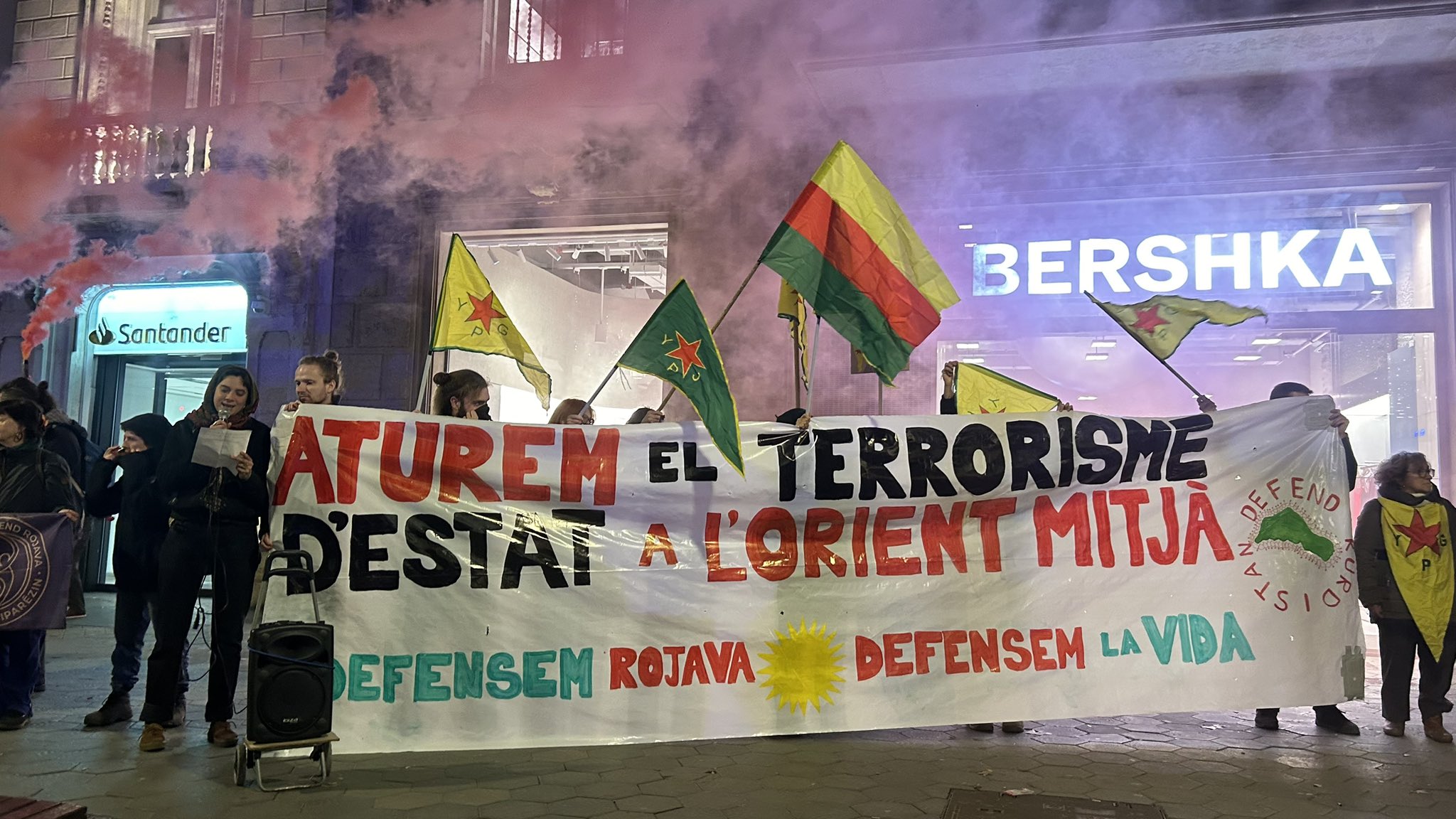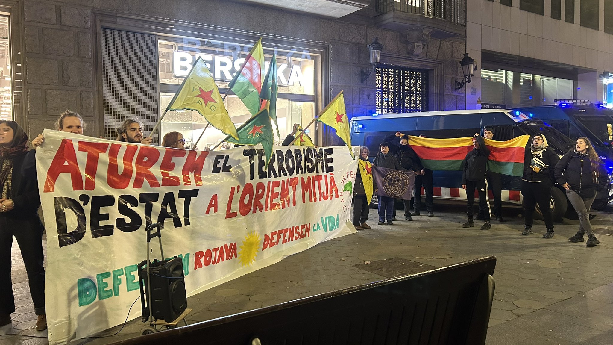 MACBA önünde yürüyüşe başlayan eylemciler, YPG, YPJ ve TEV-DEM bayrakları ve “Aturem el terrrorisme D’estat a L’orient mitja, Defensem Rojava, Defensem la vida” (Ortadoğu’da devlet terörünü durduralım, Rojava’yı savunalım, yaşamı savunalım) yazılı pankart ile yürüdü.