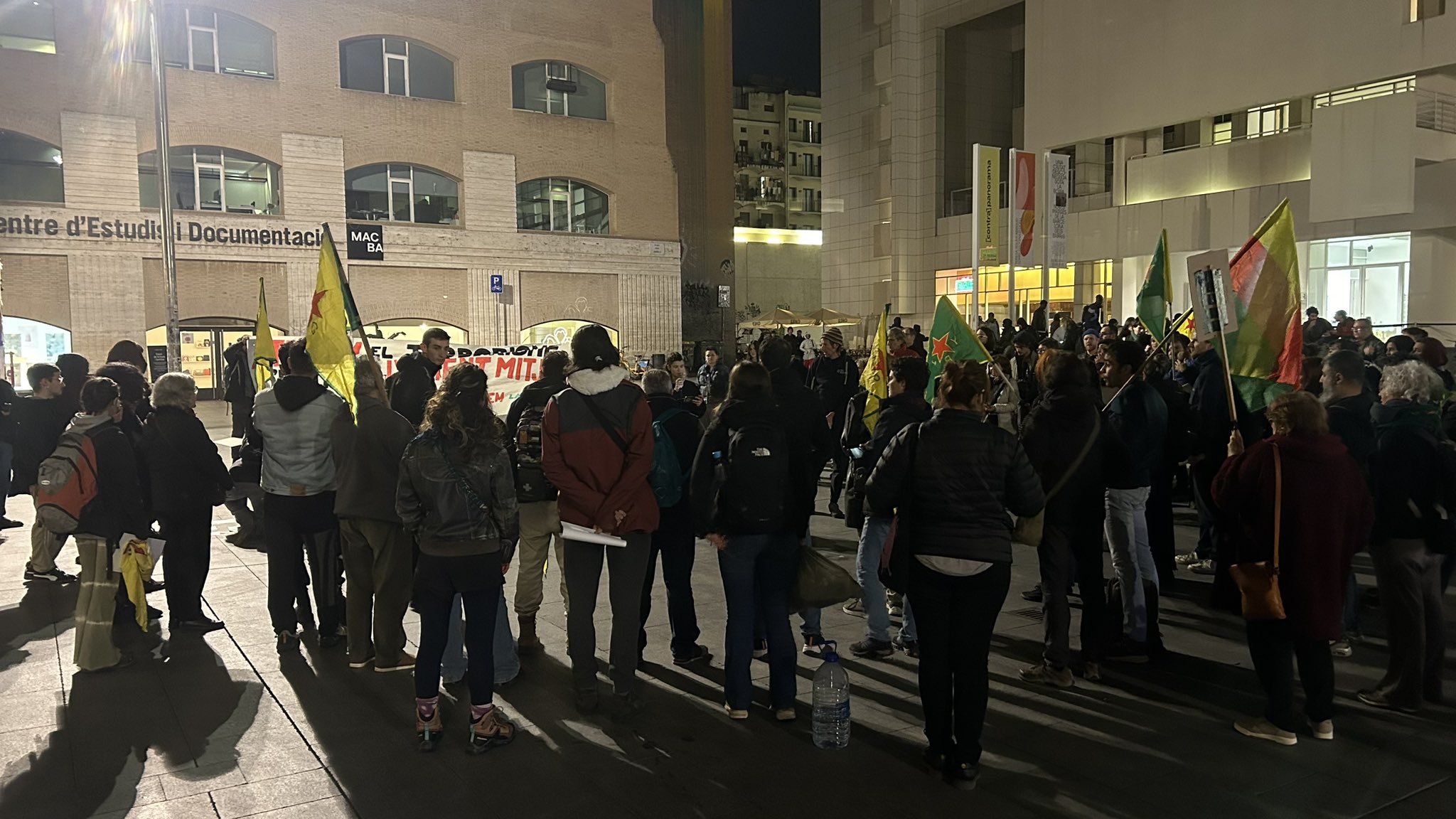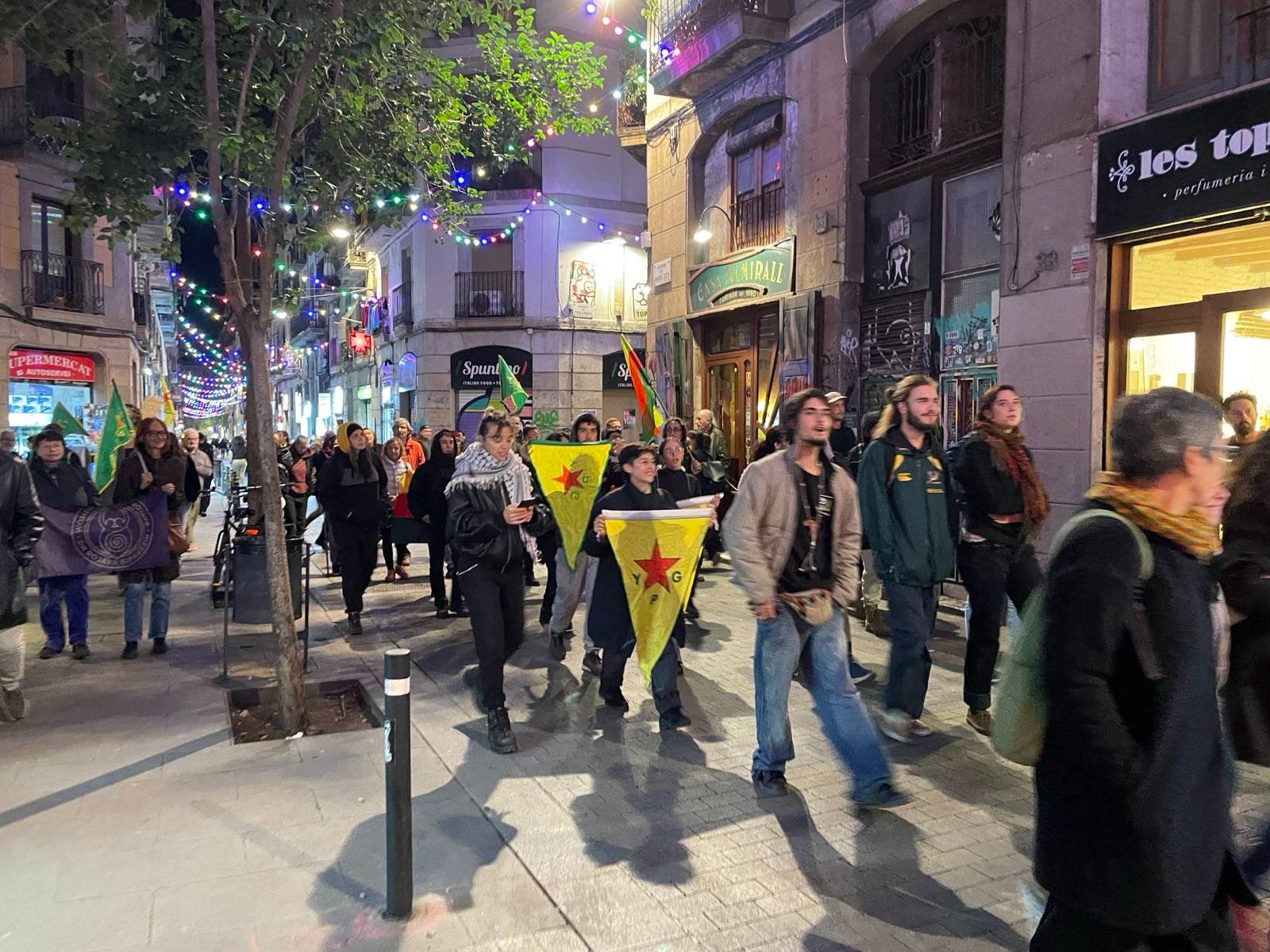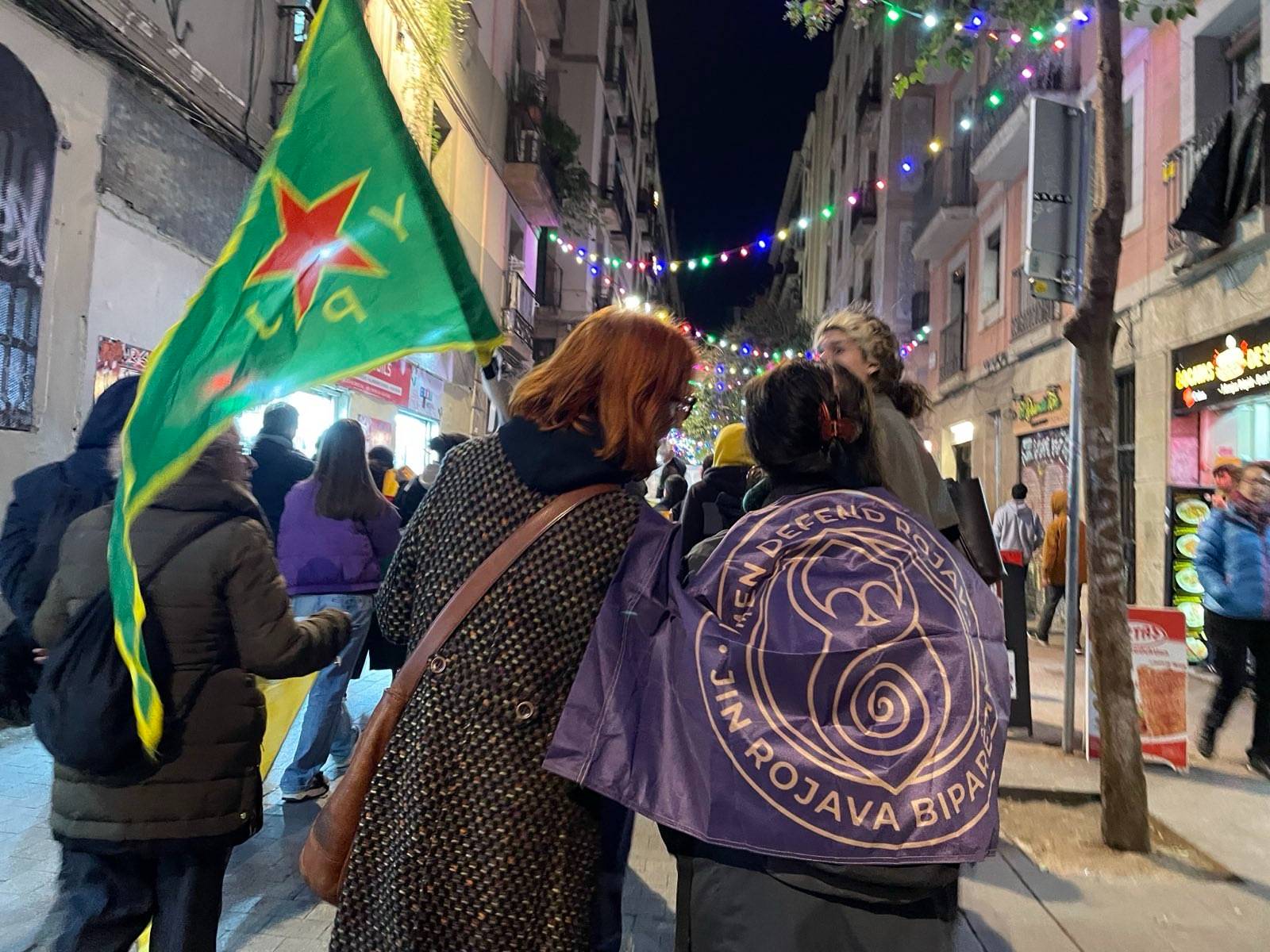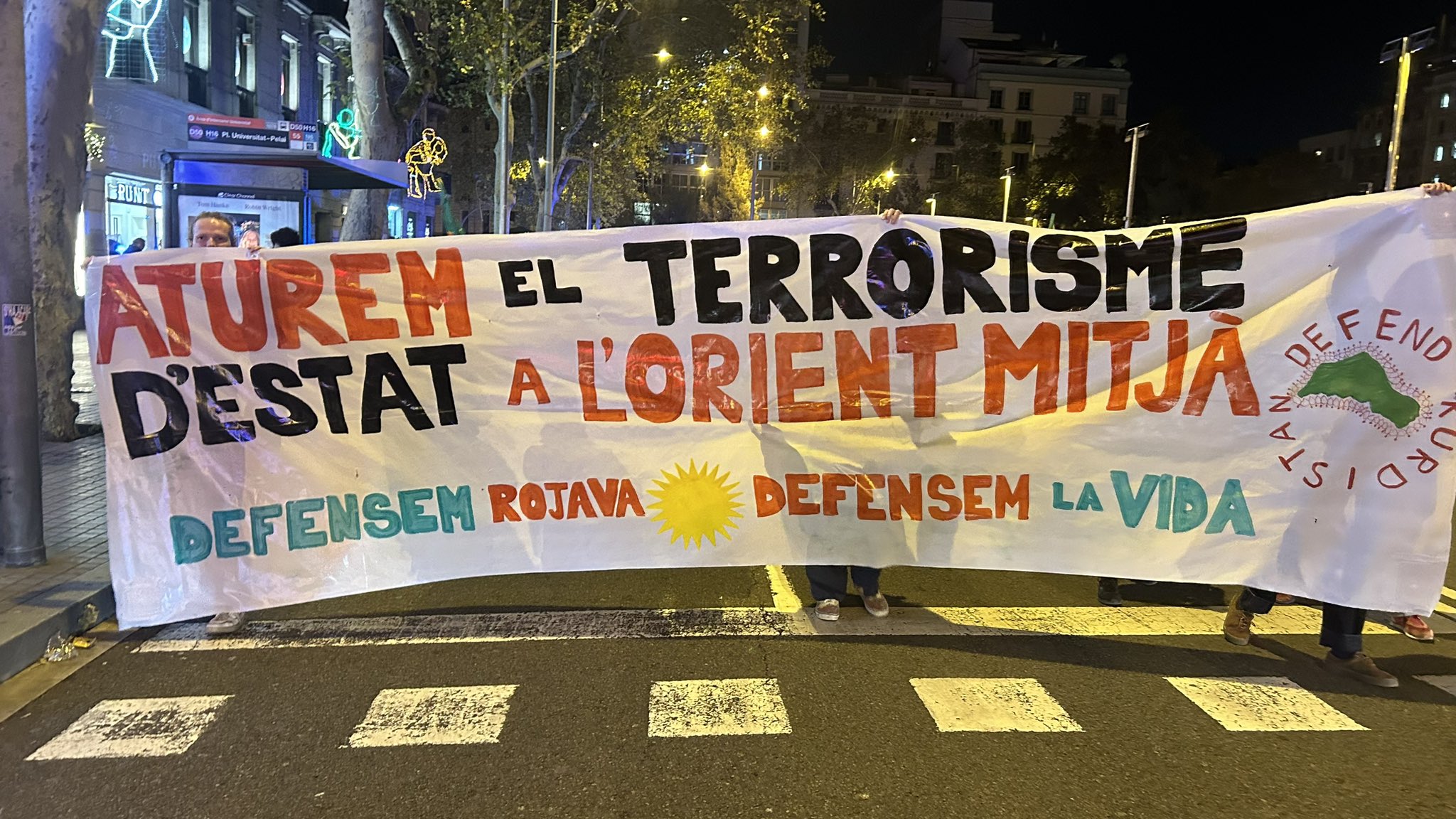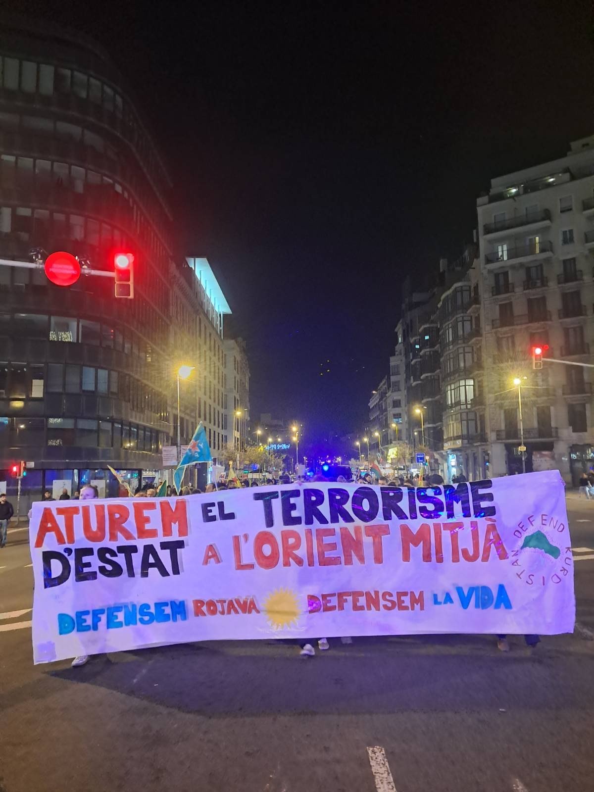 MACBA önünde yürüyüşe başlayan eylemciler, YPG, YPJ ve TEV-DEM bayrakları ve “Aturem el terrrorisme D’estat a L’orient mitja, Defensem Rojava, Defensem la vida” (Ortadoğu’da devlet terörünü durduralım, Rojava’yı savunalım, yaşamı savunalım) yazılı pankart ile yürüdü.