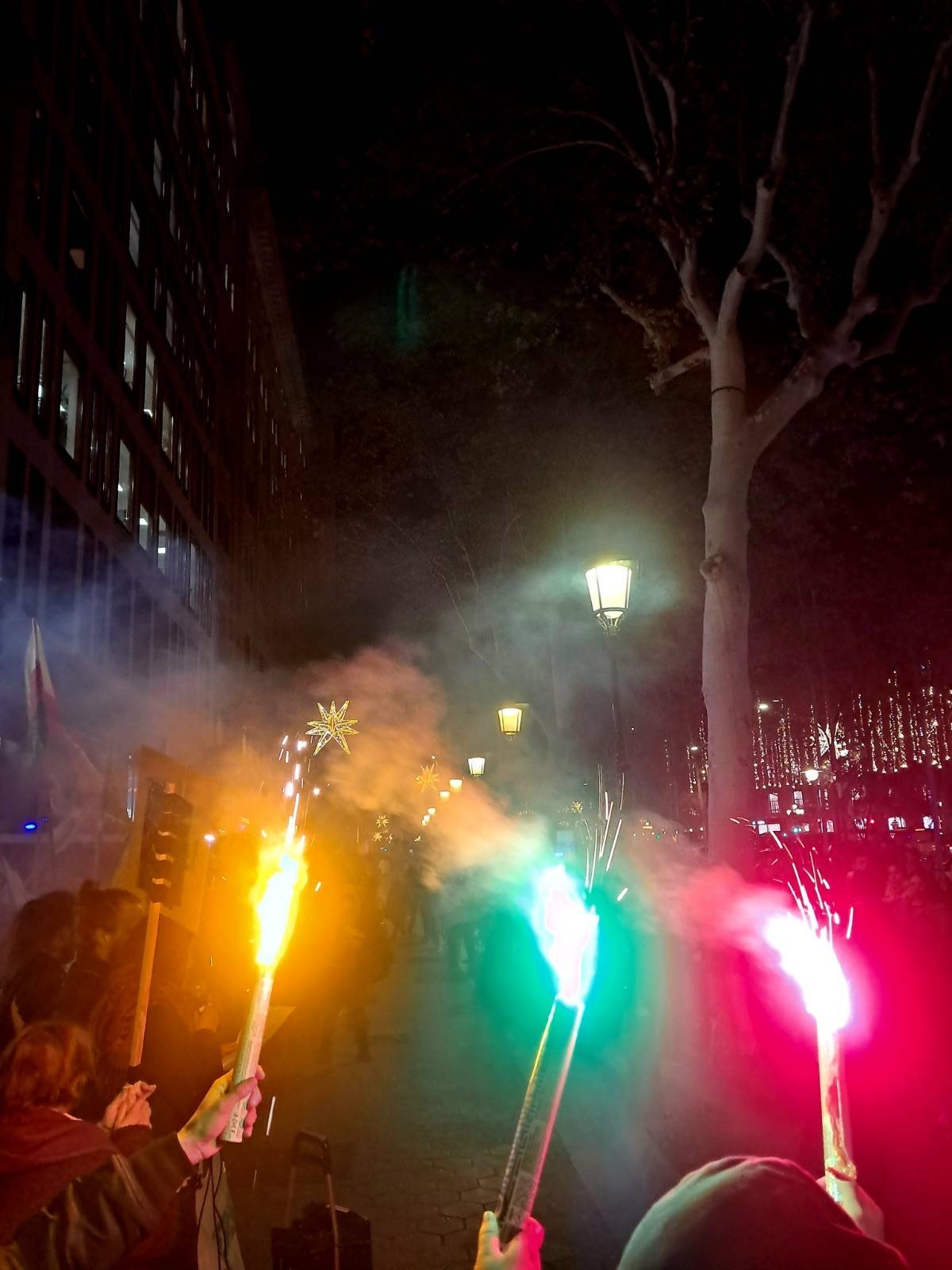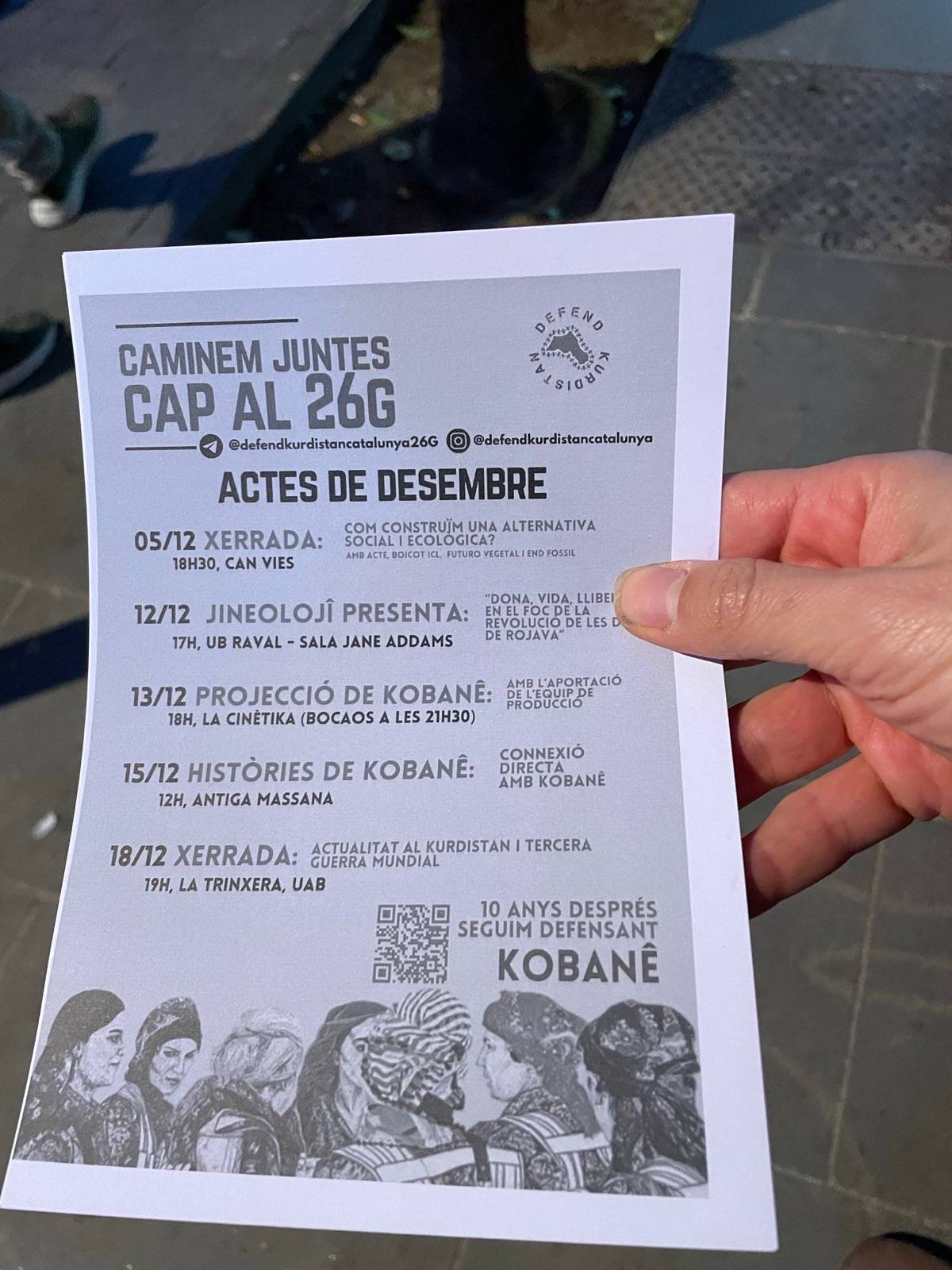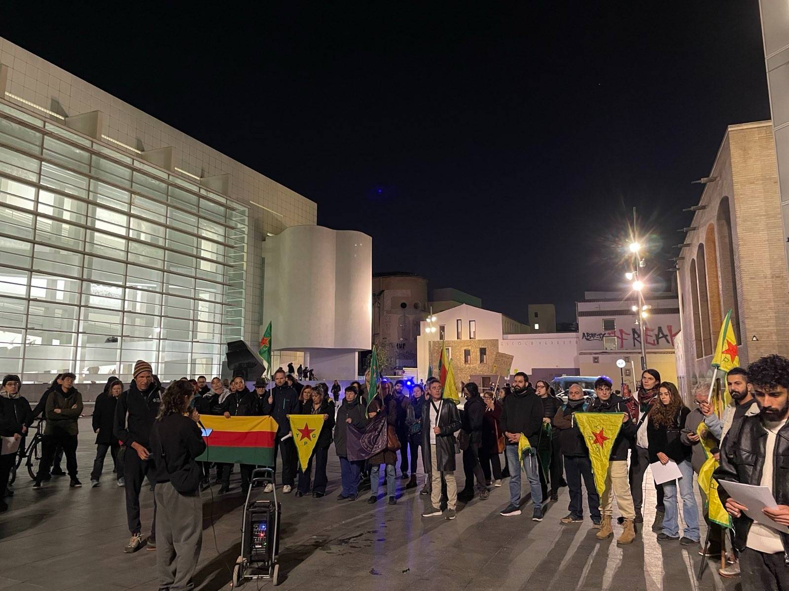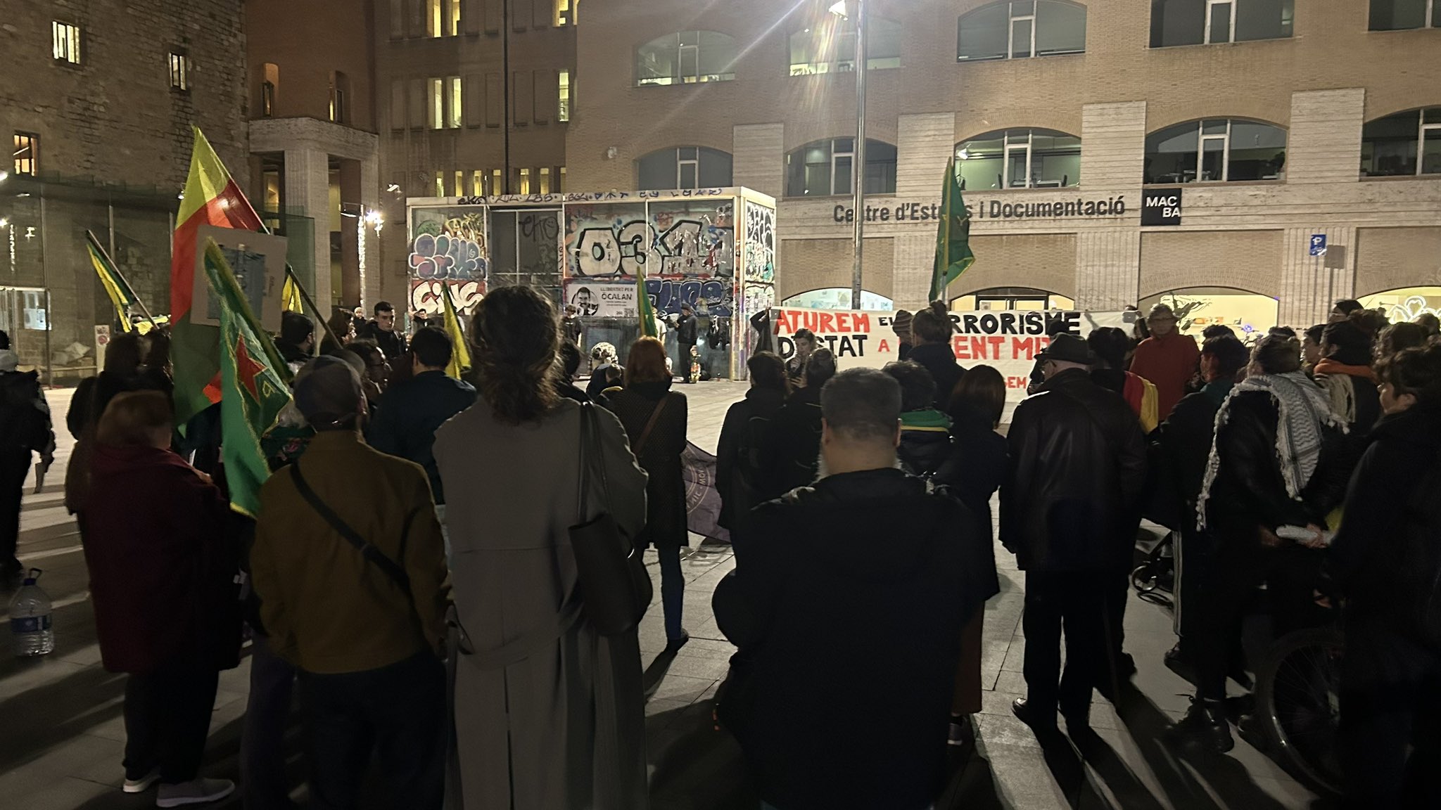 MACBA önünde yürüyüşe başlayan eylemciler, YPG, YPJ ve TEV-DEM bayrakları ve “Aturem el terrrorisme D’estat a L’orient mitja, Defensem Rojava, Defensem la vida” (Ortadoğu’da devlet terörünü durduralım, Rojava’yı savunalım, yaşamı savunalım) yazılı pankart ile yürüdü.