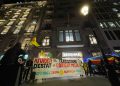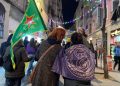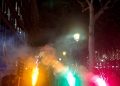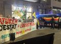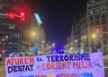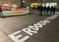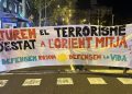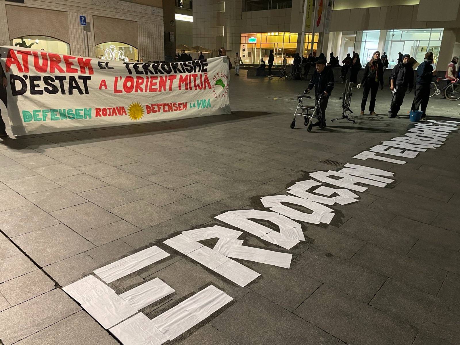 Yürüyüş öncesi oturma eylemi gerçekleştiren eylemciler, MACBA meydanında bulunan yola “Erdogan terrorista” (Terörist Erdoğan) yazdı.
