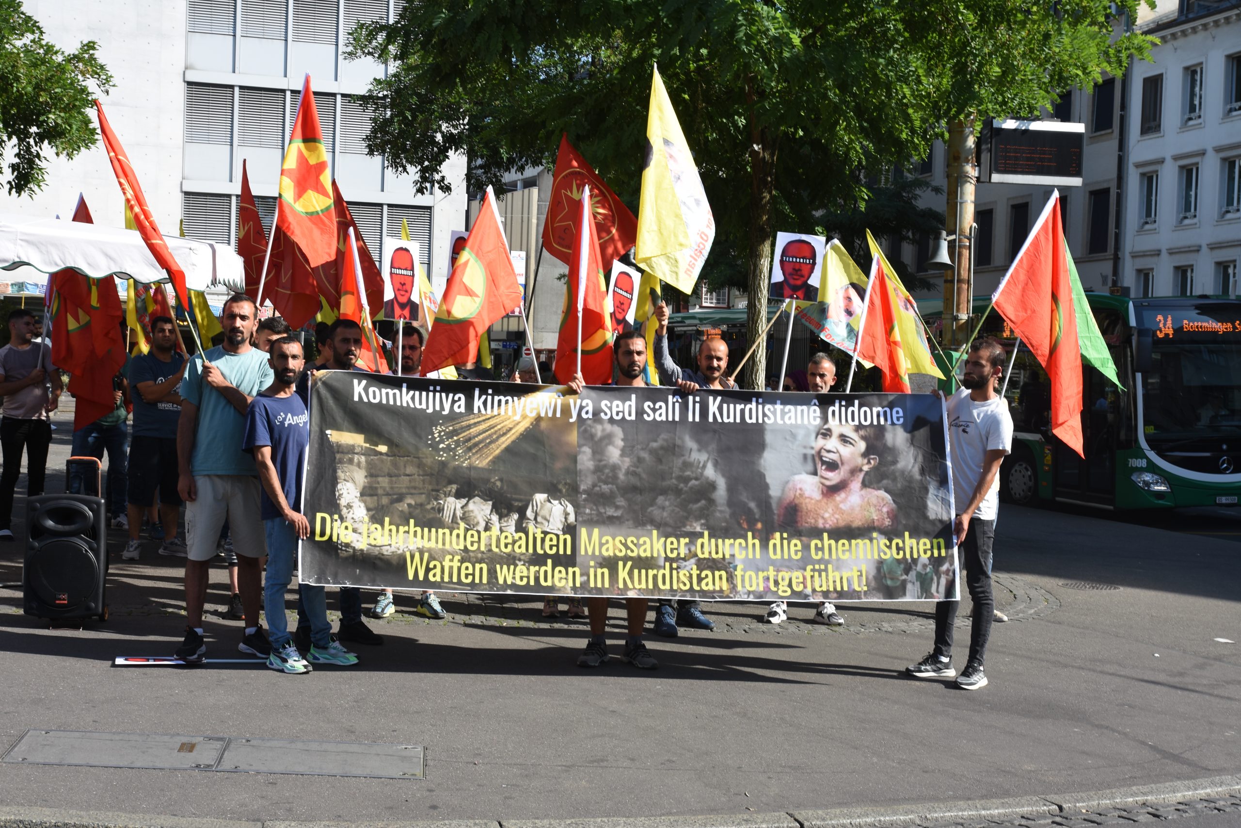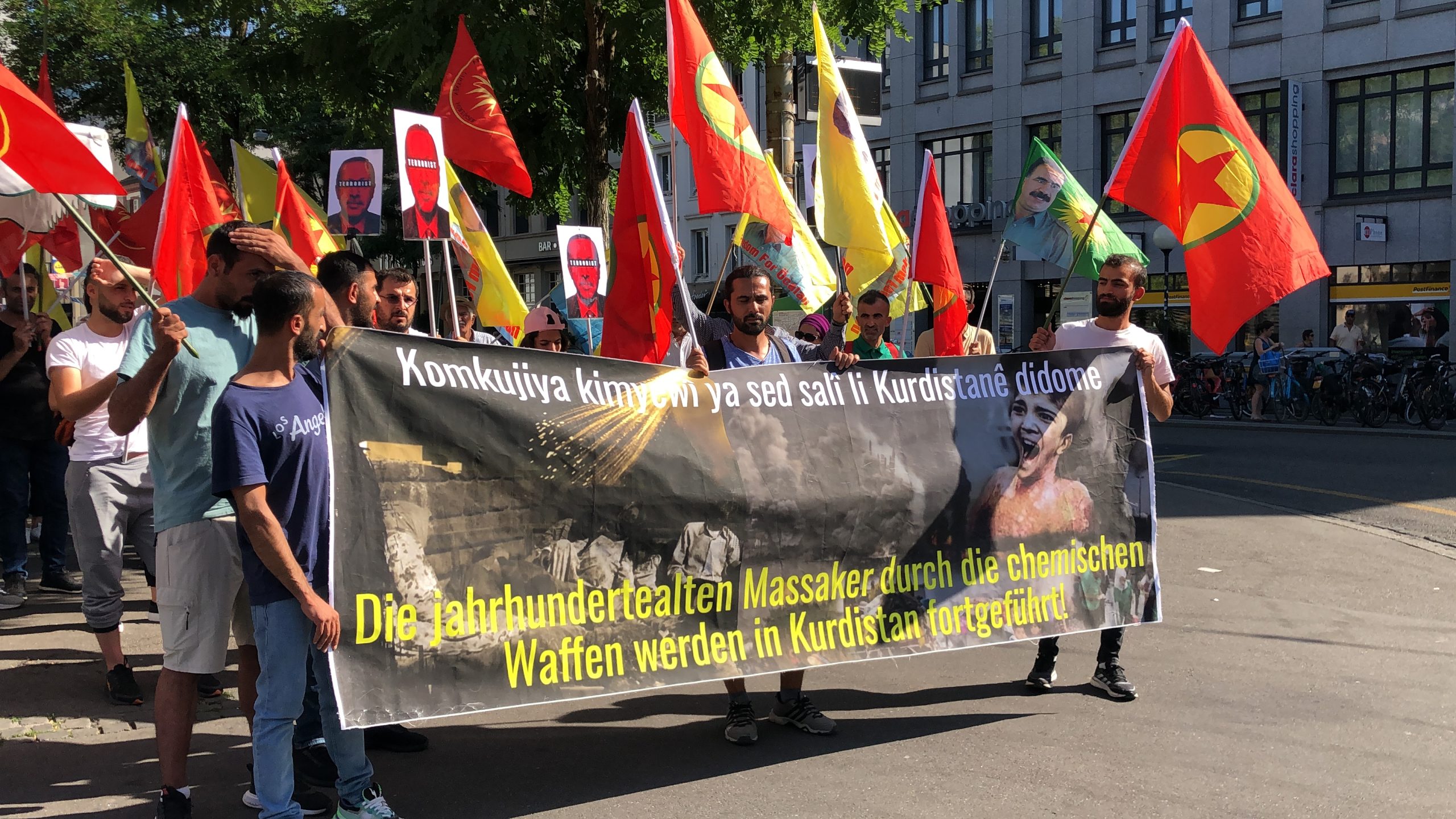 BASEL – Akşam saatlerinde Basel Claraplatz’da bir araya gelen gençler, burada bir miting gerçekleştirdi. Almanca ve Kürtçe “Kürdistan’da yüz yıldır kimyasal saldırılar devam ediyor” yazılı pankartlar taşındı. Önder Öcalan ve PKK bayrakları ile miting gerçekleştiren gençler, İsviçre devletinin Türk devleti ve KDP’ye olan desteğini protesto etti. Gençler miting boyunca “Bijî Serok APO”, “Yaşasın enternasyonal dayanışma” ve “Bijî Berxwedana Gerîla” sloganlarını attı.