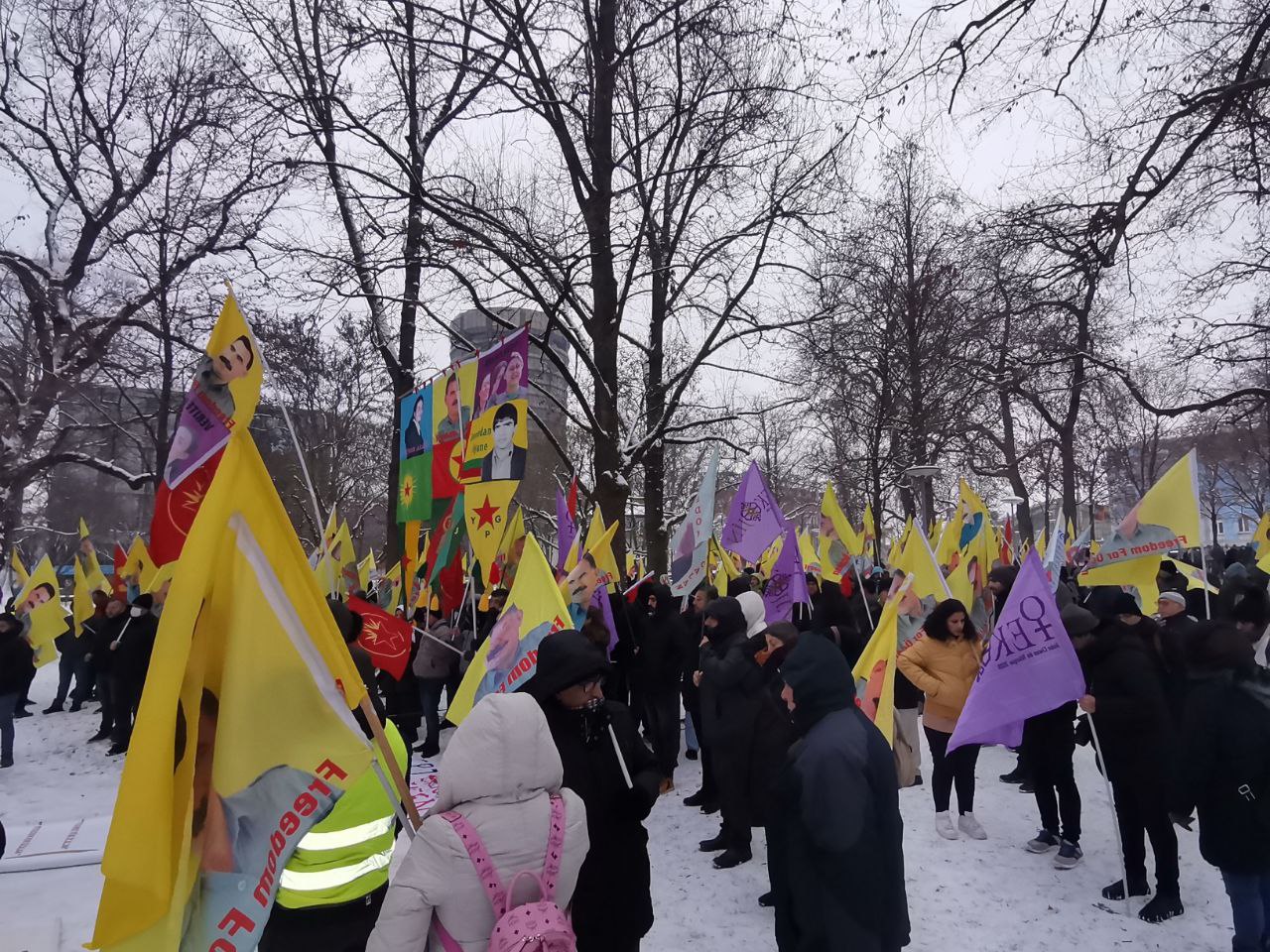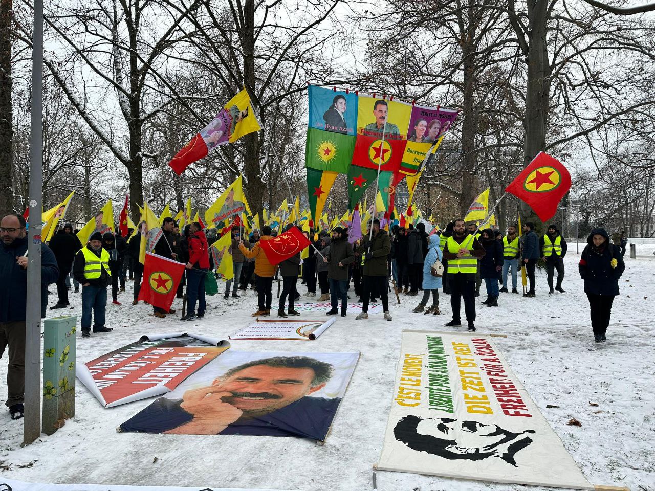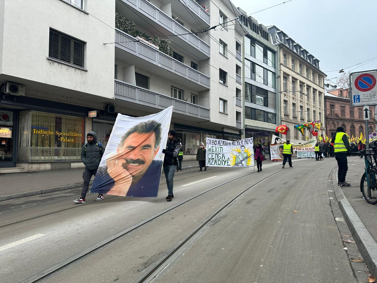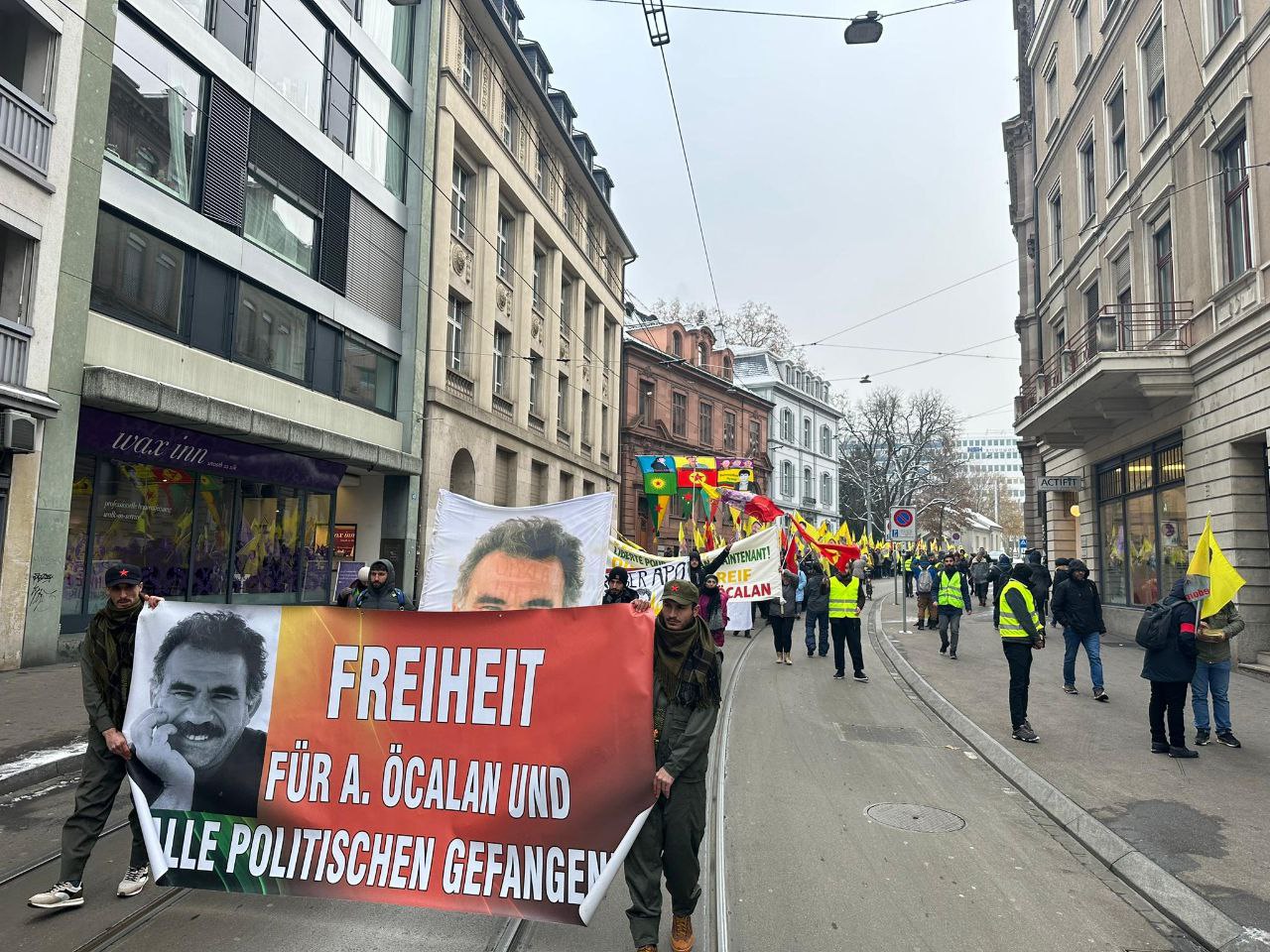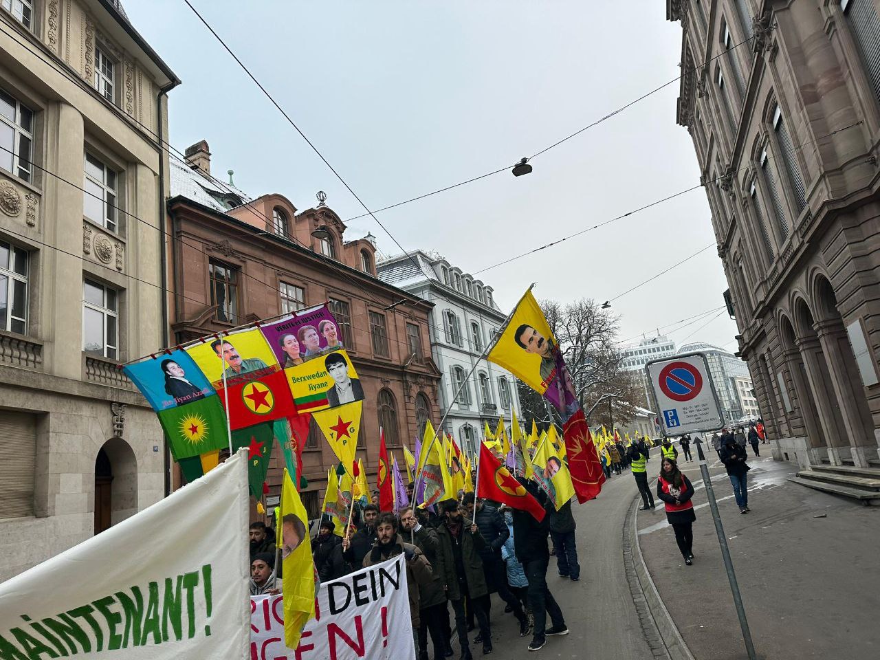 Konuşmaların ardından Almanca, Kürtçe ve Türkçe sloganlarla yürüyüşe başlayan kitle St. Alban-Graben caddesi üzerinde bir süre oturma eylemi yapıp kısa bir gösteri yaptı.