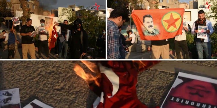 Süleymaniye’de Sera ilçesi önünde toplanan Zagros Helokanî grubu, işgalci Türk devletinin kimyasal silah kullandığına dikkat çekmek için faşist Erdoğan’ın fotoğraflarını ve bayrağını yere fırlattı.