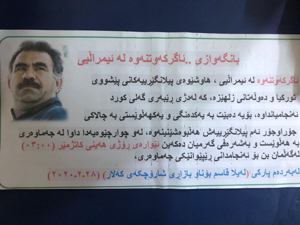Kelar’da ise Ciwanên Welatparêz bu gün Leyla Qasım parkında yapacakları yürüyüş için bildiri dağıttı. Bütün yurttaşları yapacakları yürüyüşe davet eden gençler “Gün Önder Apo İle Olma Günüdür” mesajını verdi.