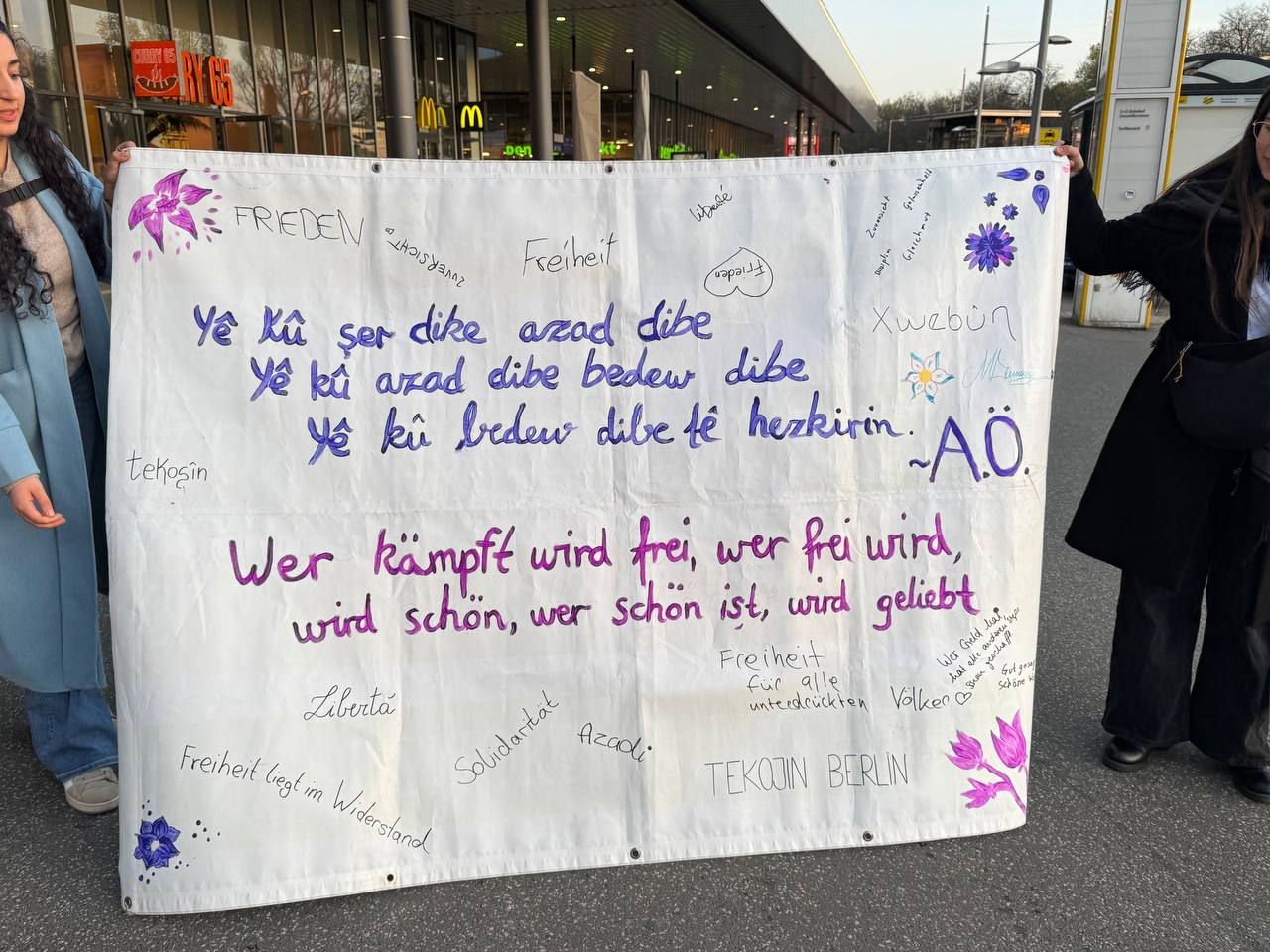 BERLİN – Jinên Ciwan ên Tekoşer (TekoJIN) üyesi genç kadınlar, Almanya’nın başkenti Berlin’de yaratıcı bir eylem gerçekleştirdi. Önder APO’nun “Wer kämpft, wird frei. Wer frei ist, wird schön. Wer schön ist, wird geliebt.” (Savaşan özgürleşir, özgürleşen güzelleşir, güzelleşen sevilir) sözünün yazılı olduğu büyük bir pankartla Berlin sokaklarını dolaştılar.