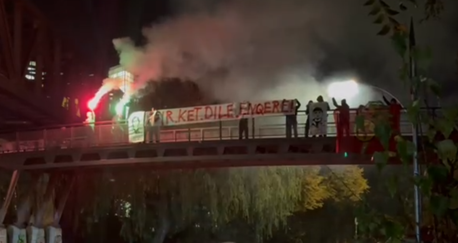 TCŞ üyeleri Berlin’de araçların sıklıkla geçtiği yolun üst geçidinde “Agir ket dile Enqere” pankartı, Şehit Asya Ali ve Rojger Hêlîn’in porteleri ve PKK bayrağı açarak havai fişekler patlattı.