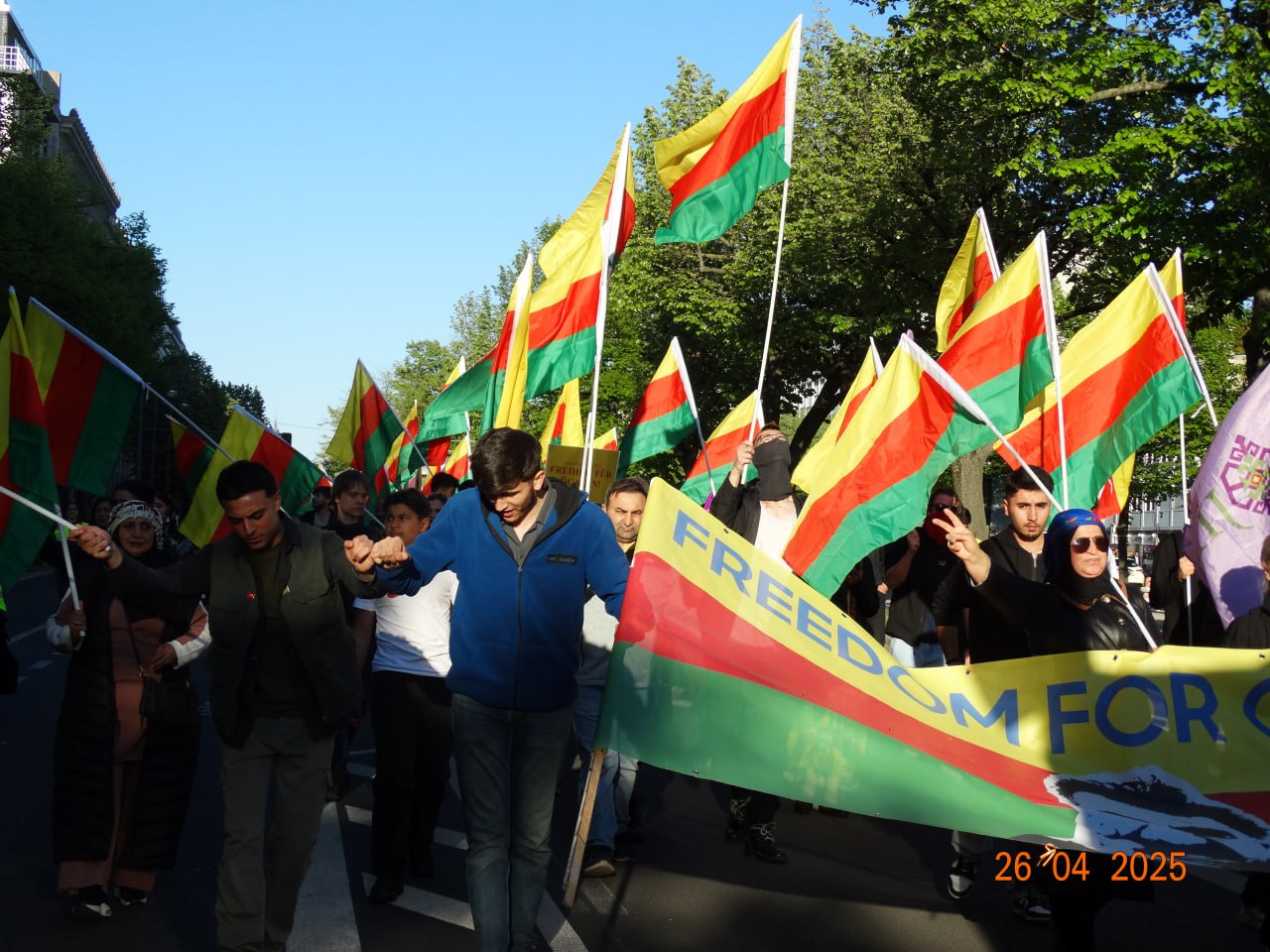 Açıklama ardından Brandenburger Tor’a doğru yürüyüşe geçildi. Yürüyüş boyunca “Bijî Serok APO”, “Jin Jiyan Azadî” ve “Bê Serok Jiyan Nabe” sloganları yankılandı.